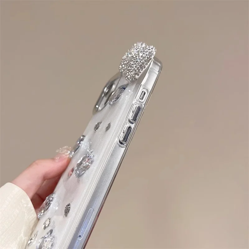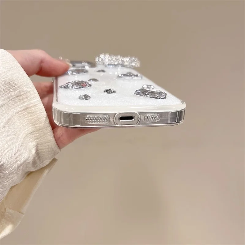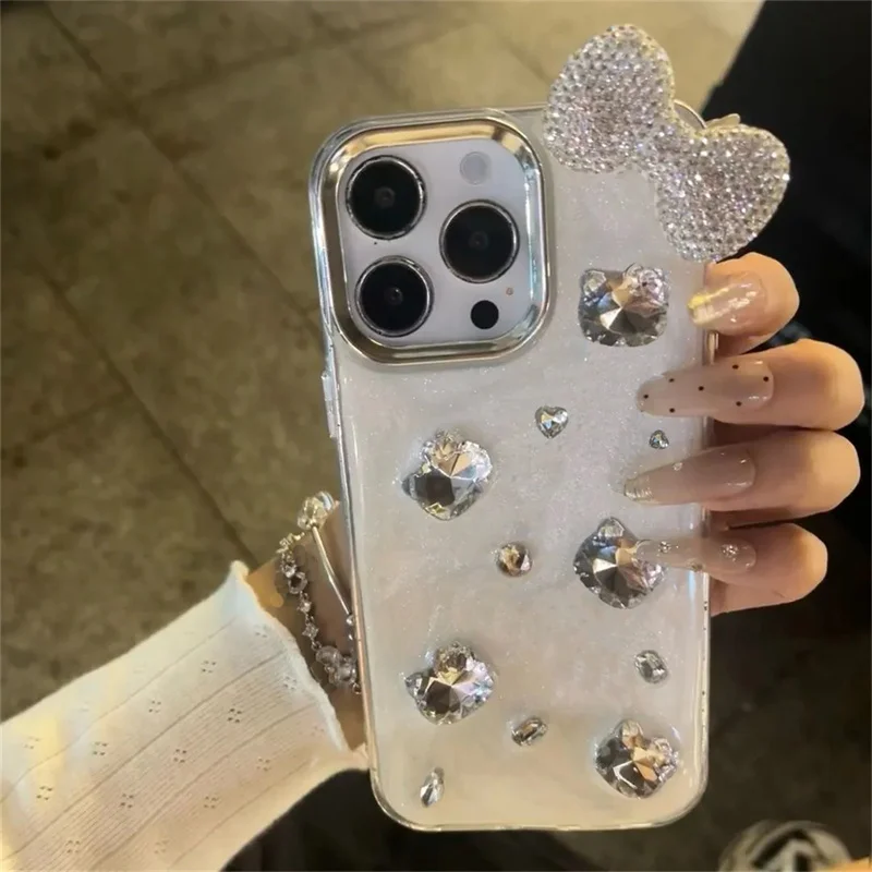 Comprar Funda de teléfono con lazo y diamantes de imitación brillantes 3D de lujo para iPhone 16 14 13 12 11 15 Pro Max, funda protectora trasera suave y bonita, carcasa epoxi