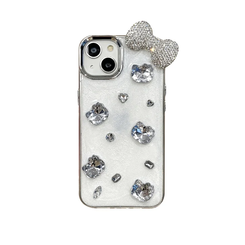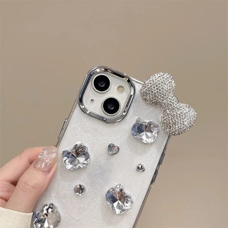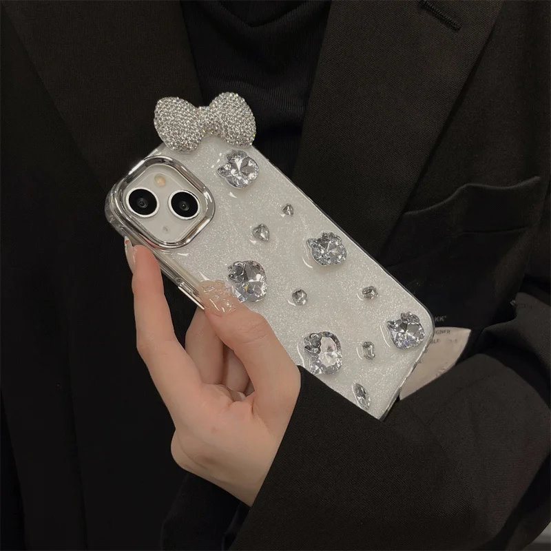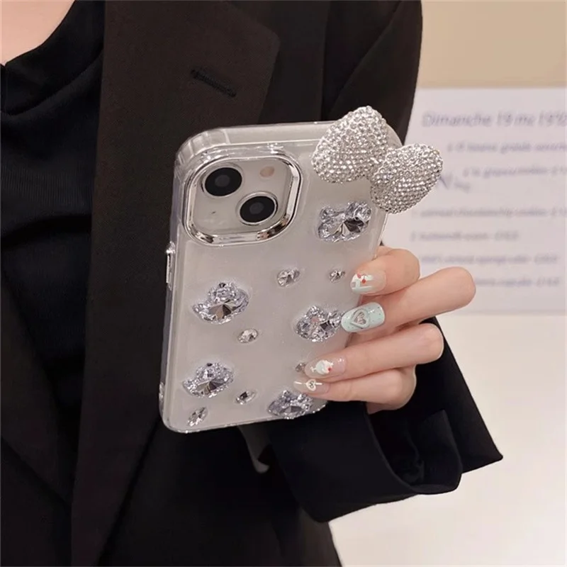 Funda de teléfono con lazo y diamantes de imitación brillantes 3D de lujo para iPhone 16 14 13 12 11 15 Pro Max, funda protectora trasera suave y bonita, carcasa epoxi