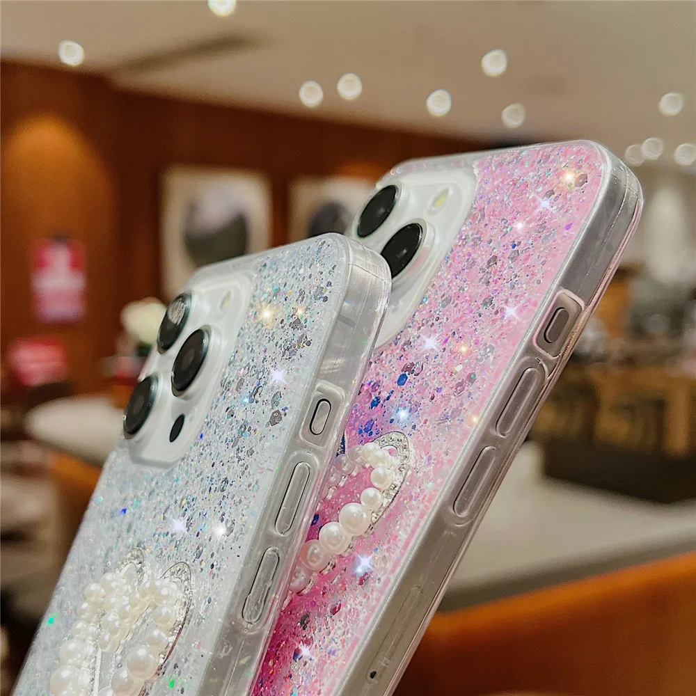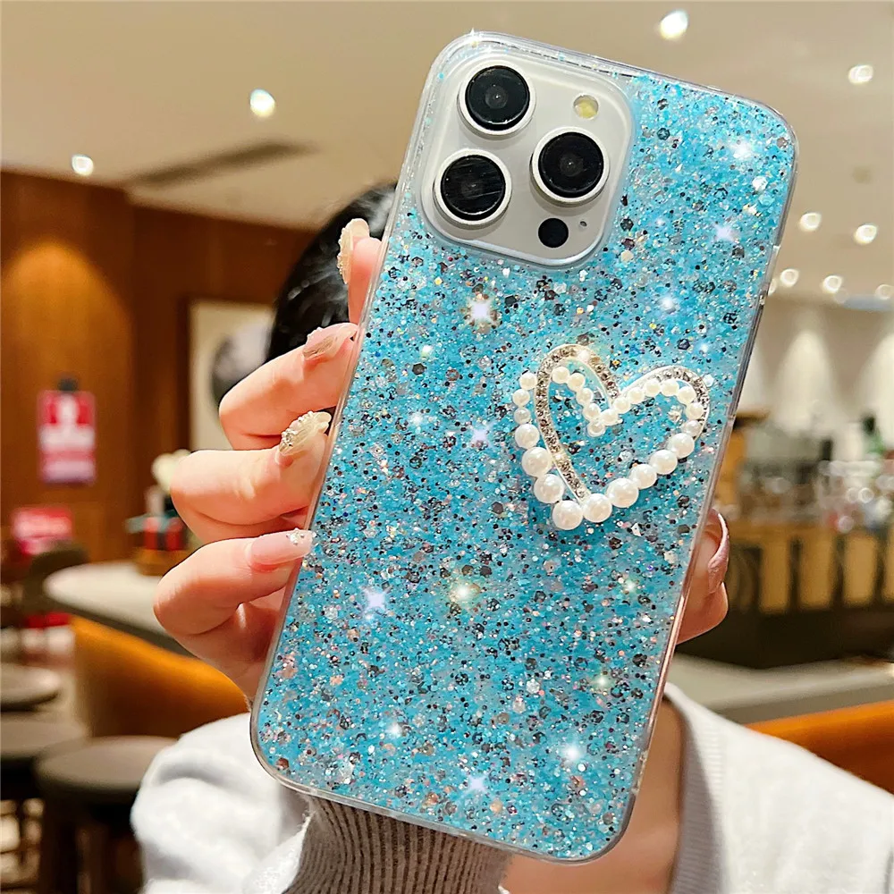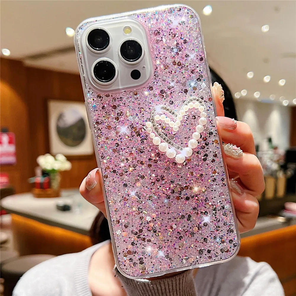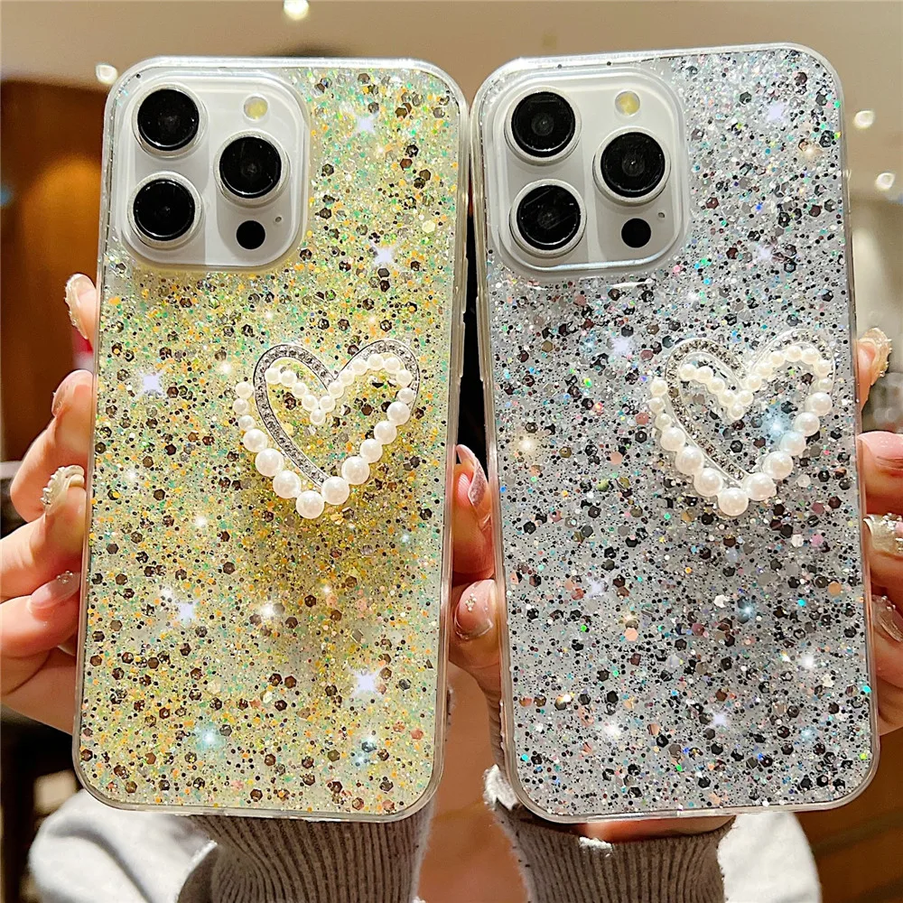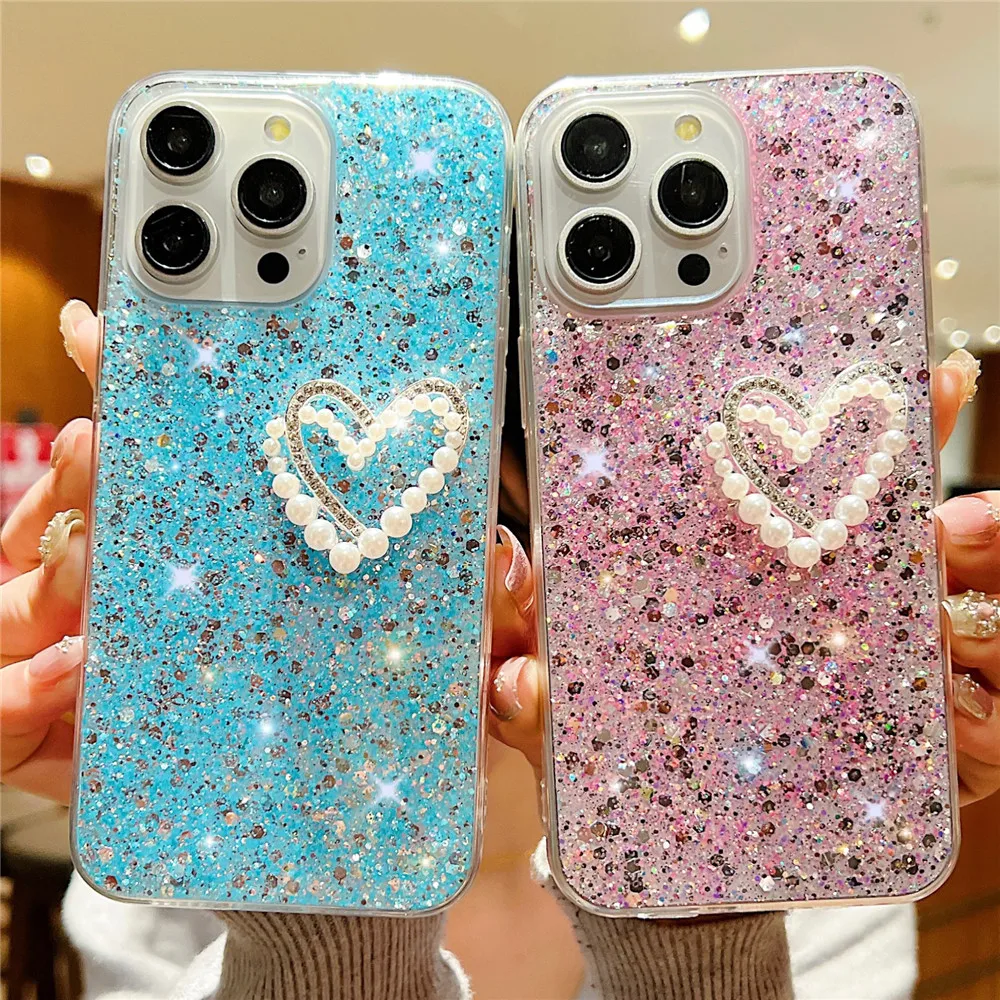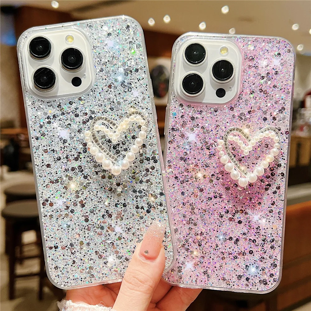 Comprar Funda de teléfono de lentejuelas con purpurina de corazón de amor de perlas 3D de lujo para Samsung A05S, A25, A35, A55, A14, A24, A34, A54, A13, A23, A33, A22, A32, A52