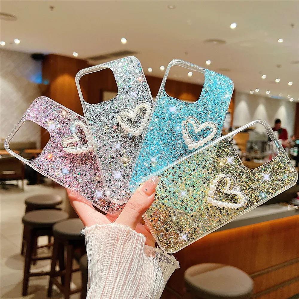 Comprar Funda de teléfono de lentejuelas con purpurina de corazón de amor de perlas 3D de lujo para Samsung A05S, A25, A35, A55, A14, A24, A34, A54, A13, A23, A33, A22, A32, A52