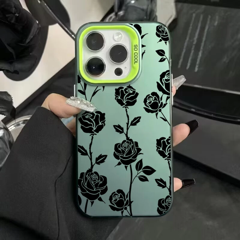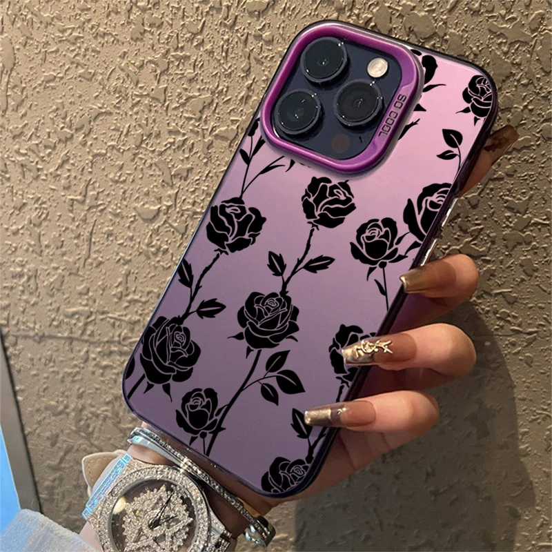 Funda de teléfono de lujo con flor rosa Vintage para iPhone 16 12 13 14 11 15 Pro Max 7 8 Plus SE2 X XR XS MAX, fundas traseras negras a prueba de golpes