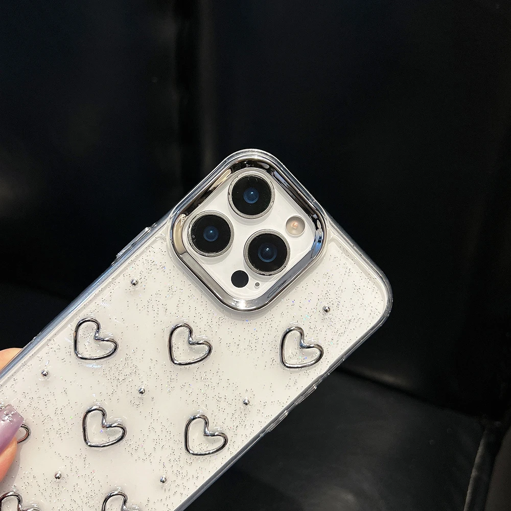 Funda de teléfono de lujo con flor plateada y purpurina de corazón de amor para iPhone 16 15 14 13 Pro Max, bonita funda protectora Floral a prueba de golpes, bonita funda trasera transparente