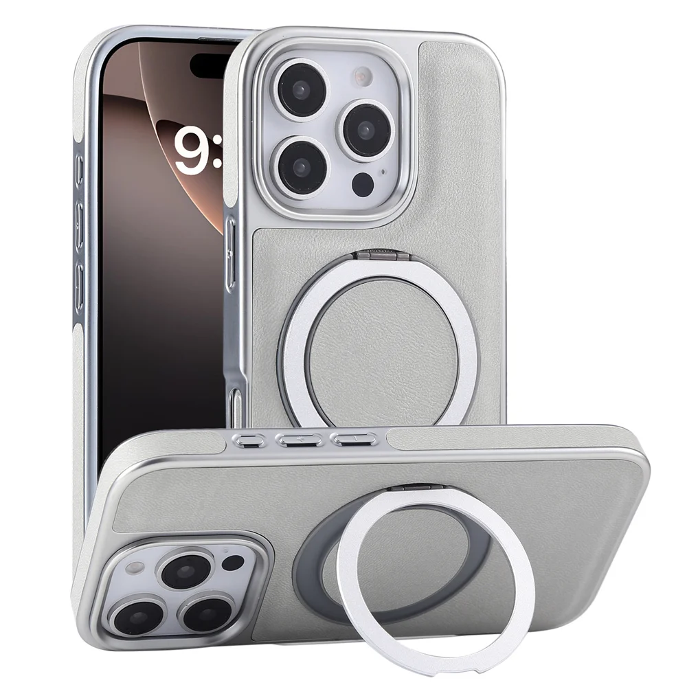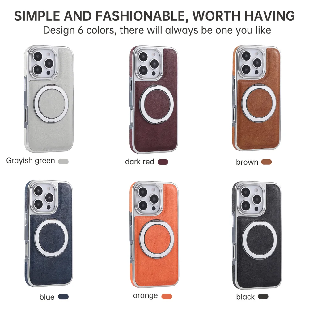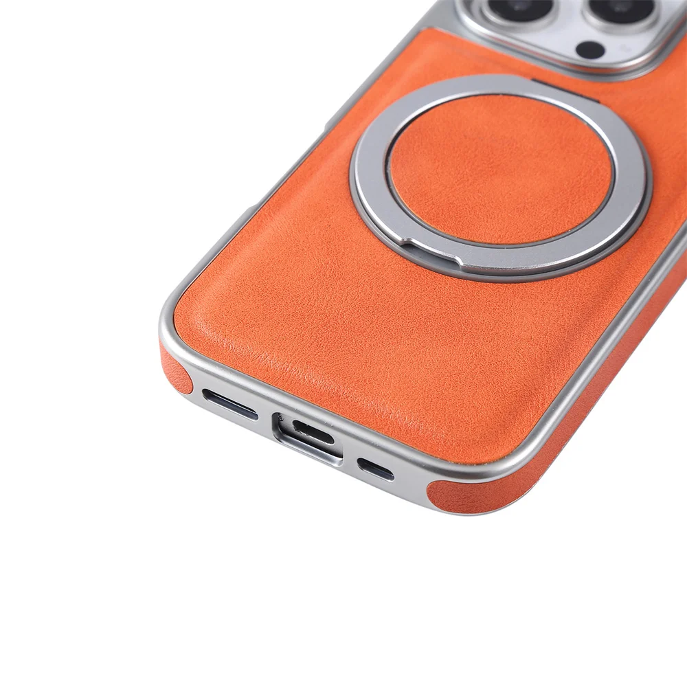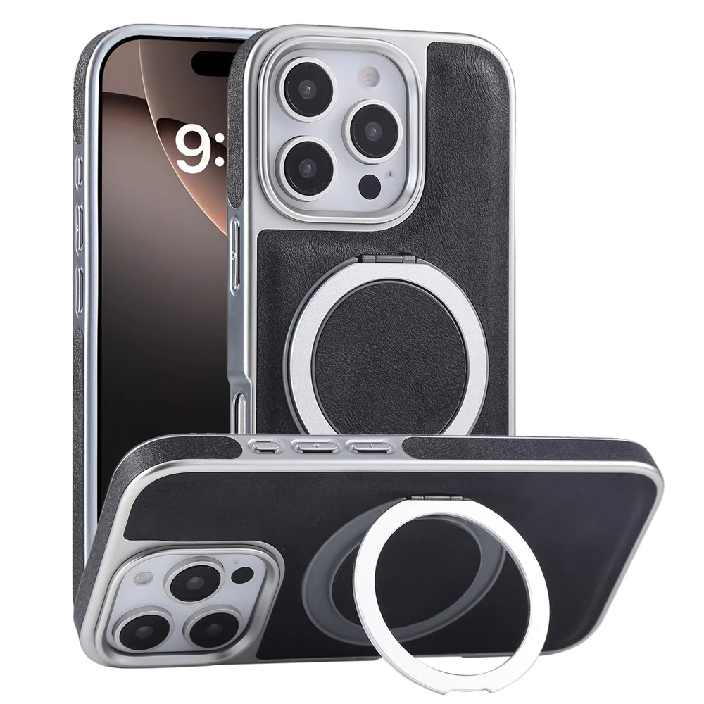 360 Rotation Hidden Stand Classic Leather Magnetic Phone Case For iPhone 14 13 15 16 Pro Max Plating Frame Protective Back Cover