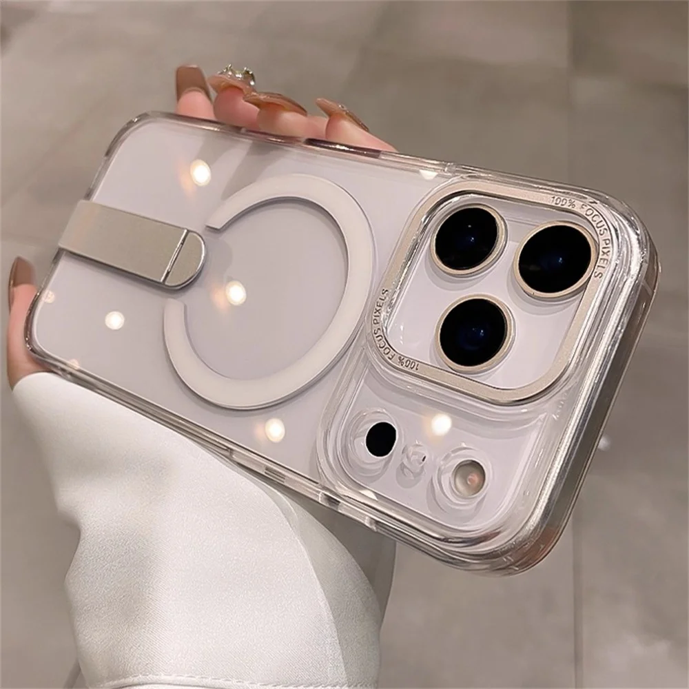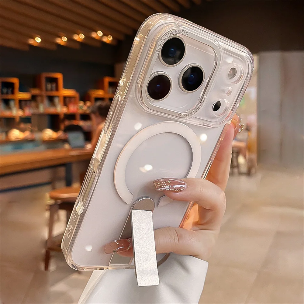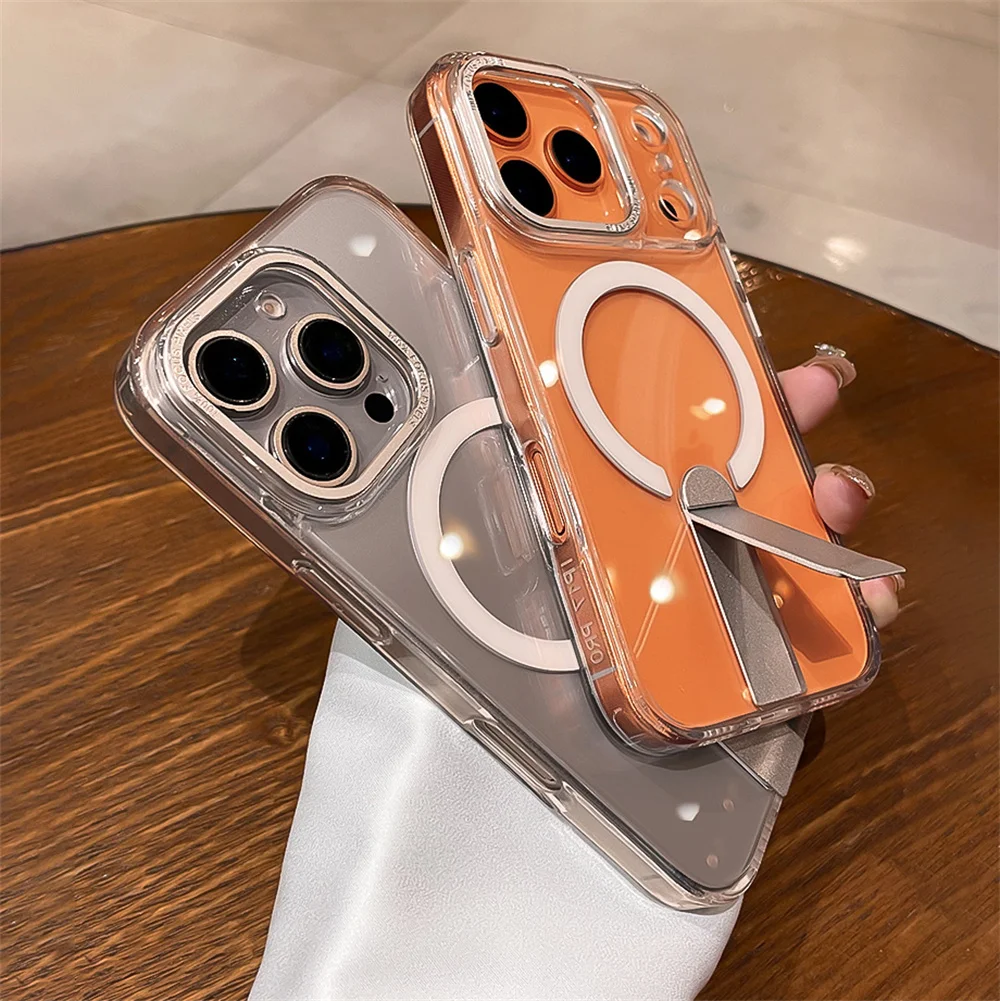 Funda de teléfono magnética de PC altamente transparente con soporte plegable de lujo para iPhone 17 16 15 14 13 12 Pro Max para funda de carga inalámbrica Magsafe