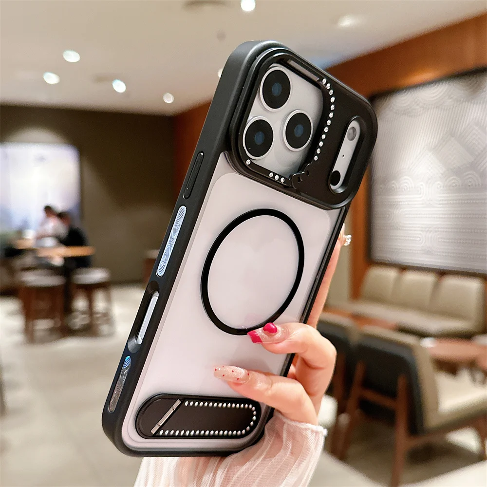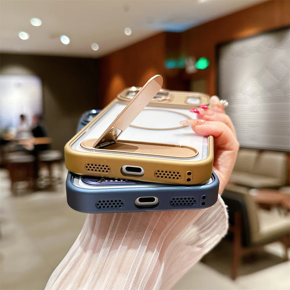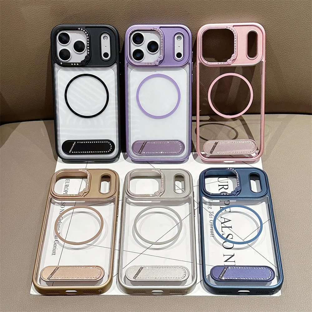 Funda de teléfono magnética transparente con soporte Invisible de lujo para iPhone 17 16 15 14 13 Pro Max Air Plus cubierta de armadura de parachoques de Color sólido