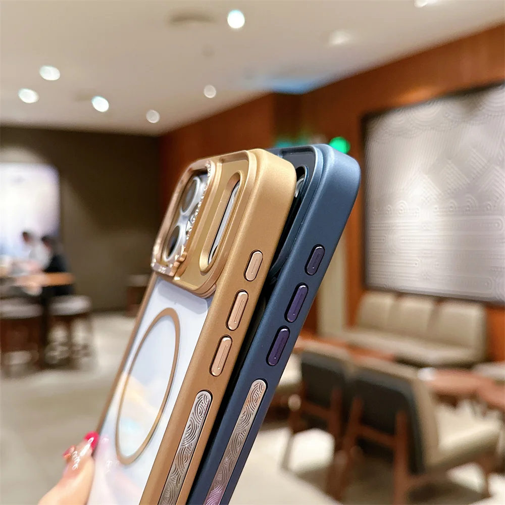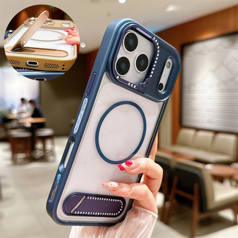 Funda de teléfono magnética transparente con soporte Invisible de lujo para iPhone 17 16 15 14 13 Pro Max Air Plus cubierta de armadura de parachoques de Color sólido