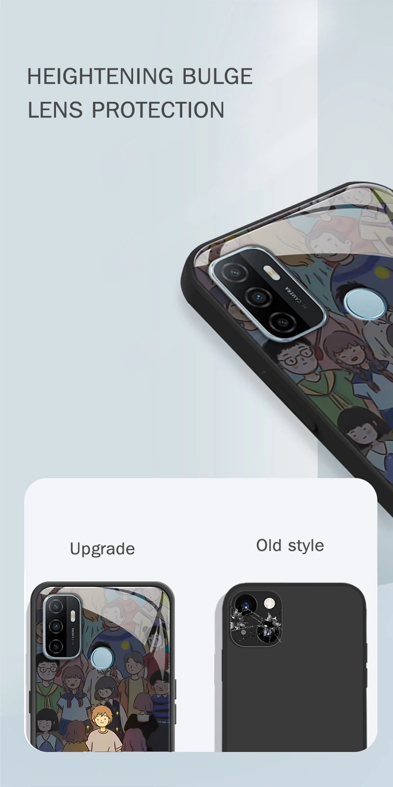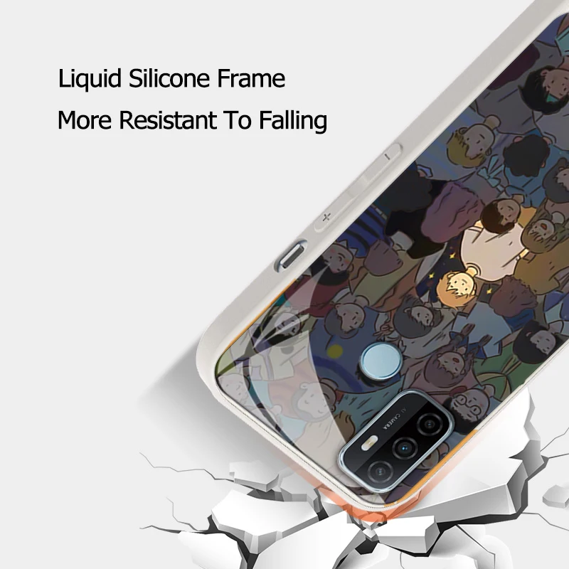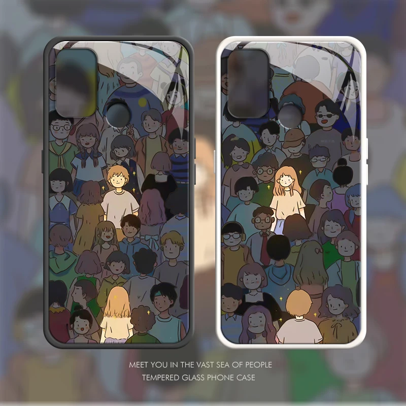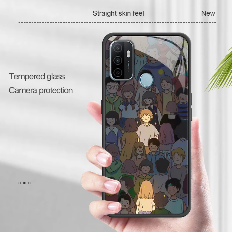 Funda de teléfono con marco de silicona de borde recto para OPPO A52 A53 2020 A53S A54 4G 5G, cubierta trasera dura de vidrio templado de lujo, Funda de dibujos animados