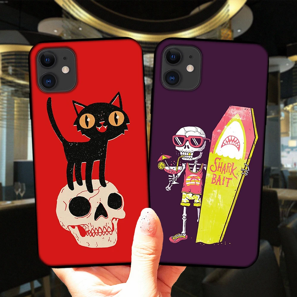 Funda de teléfono con divertido gato escalonado con máscara de calavera para iPhone 12 Mini 11 Pro XS Max 6S 8 7 Plus X XR SE 2020 funda negra de silicona suave