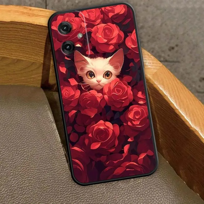 Funda de teléfono negra con diseño de gato y flores de dibujos animados populares para Motorola G85 Edge 50 G24 G35 G14 G04 40 G72 G34 G31 G Stylus G54 G13 G32 5G