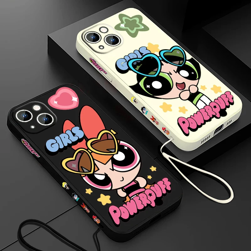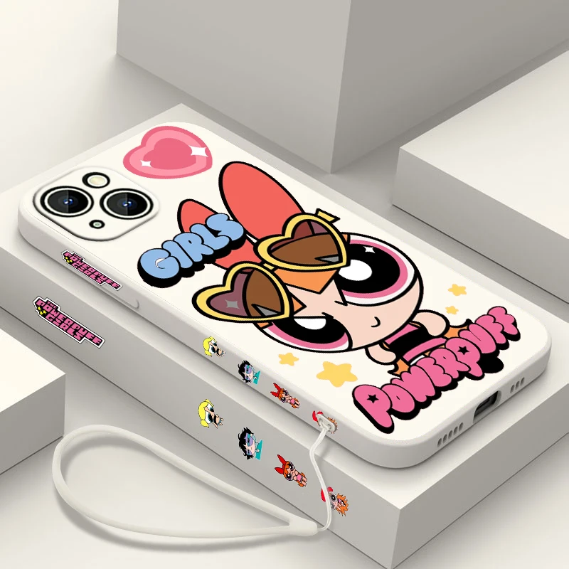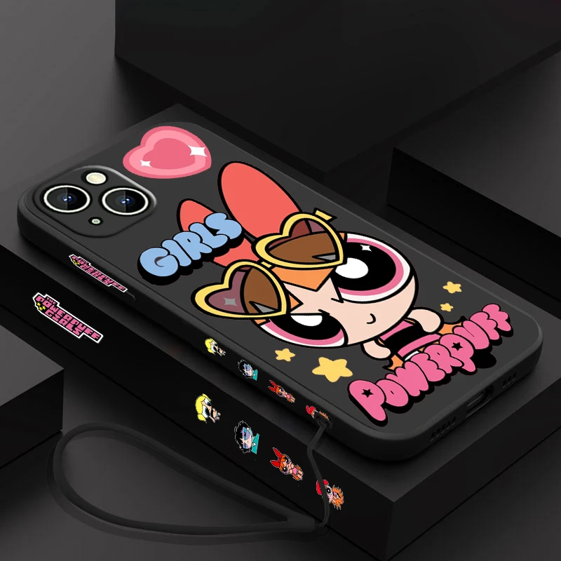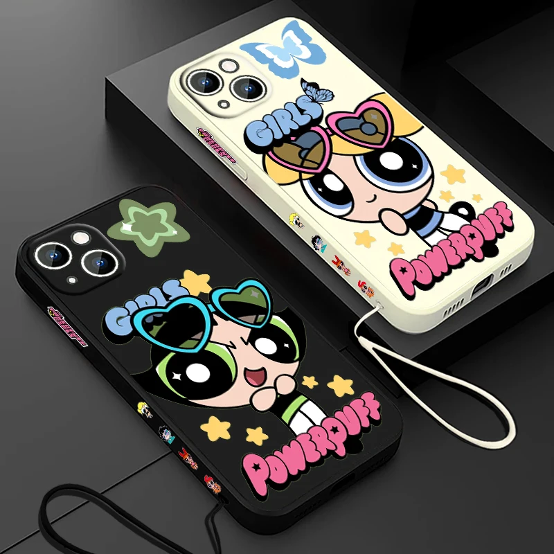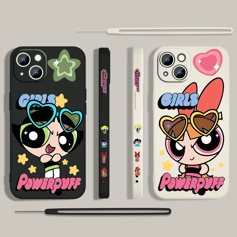 Funda de teléfono para niñas P-Powerpuff divertida y bonita para Apple iPhone 15 14 13 12 11 Pro Max Plus 8 7 SE cubierta de capa de cuerda izquierda líquida