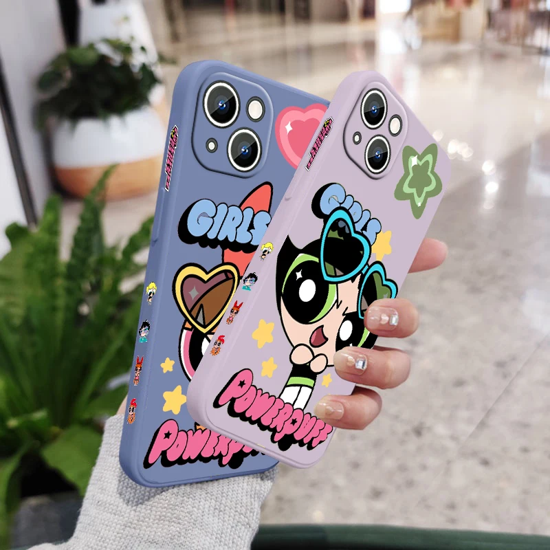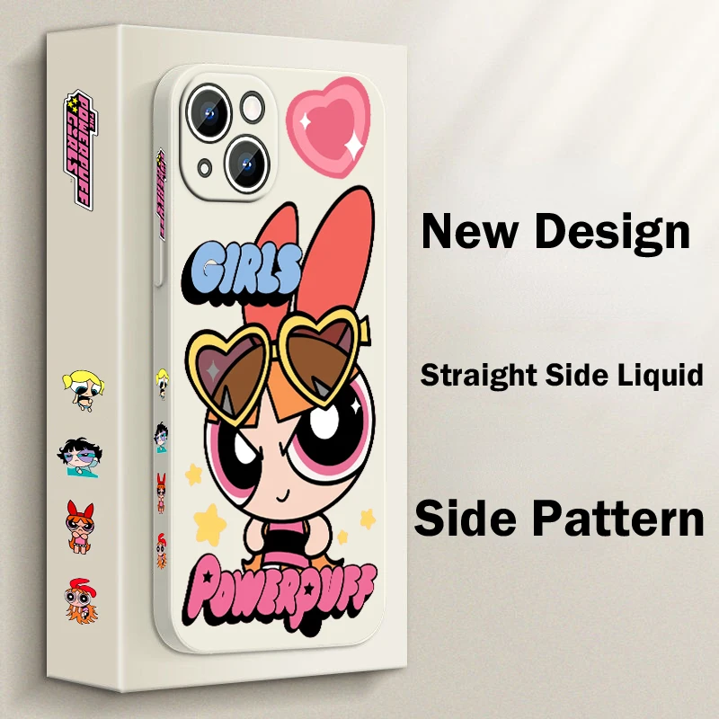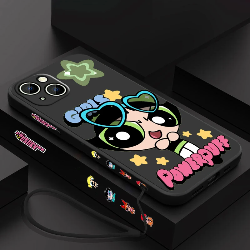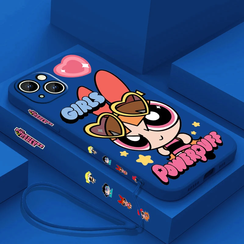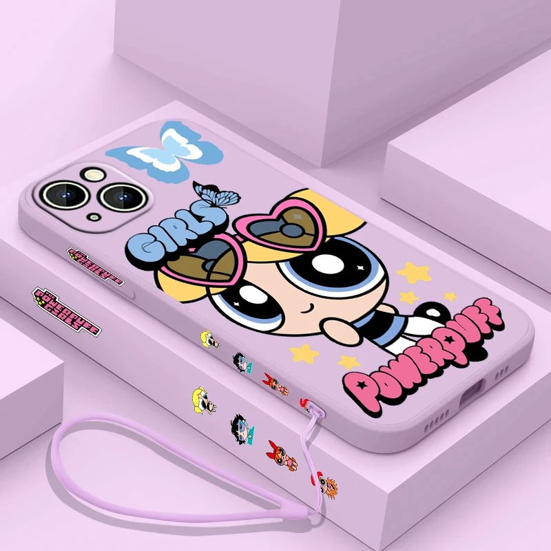 Funda de teléfono para niñas P-Powerpuff divertida y bonita para Apple iPhone 15 14 13 12 11 Pro Max Plus 8 7 SE cubierta de capa de cuerda izquierda líquida