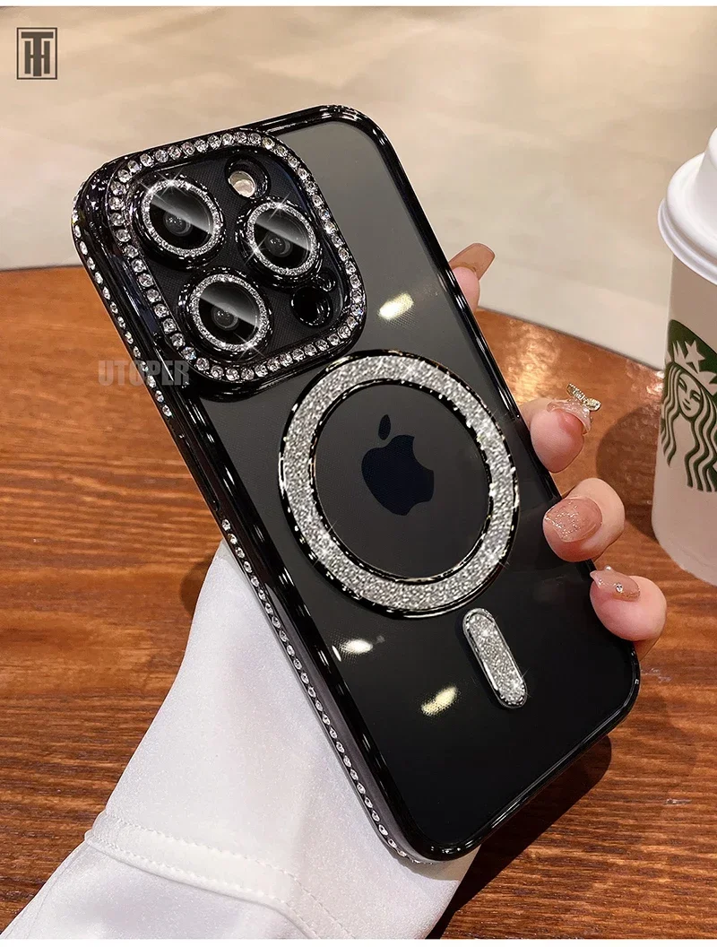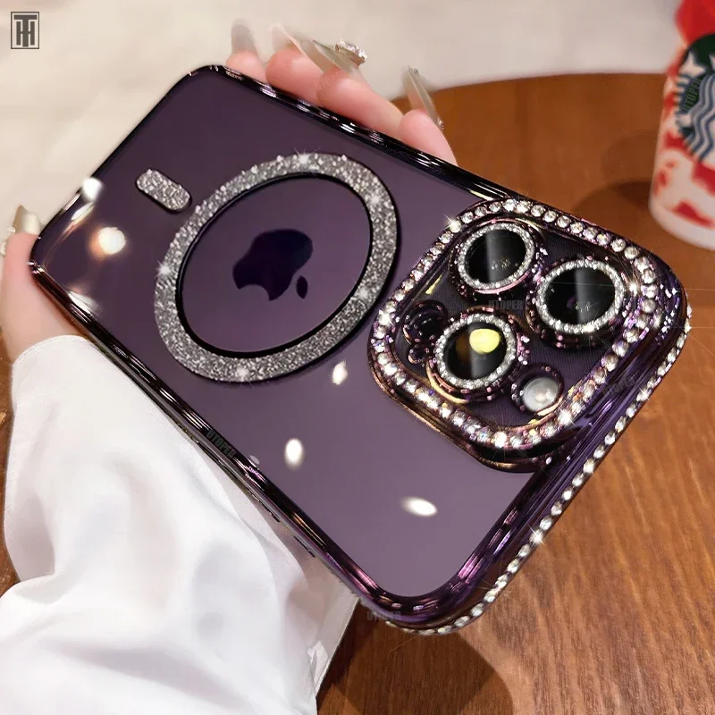 Funda de teléfono con película de lente de cristal ostentoso de lujo para iPhone 15 11 12 13 14 Pro Max Plus Magsafe, cubierta transparente con carga inalámbrica magnética