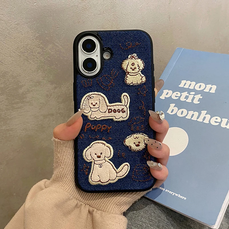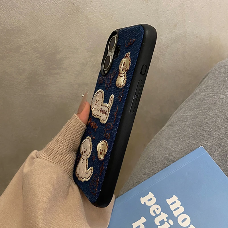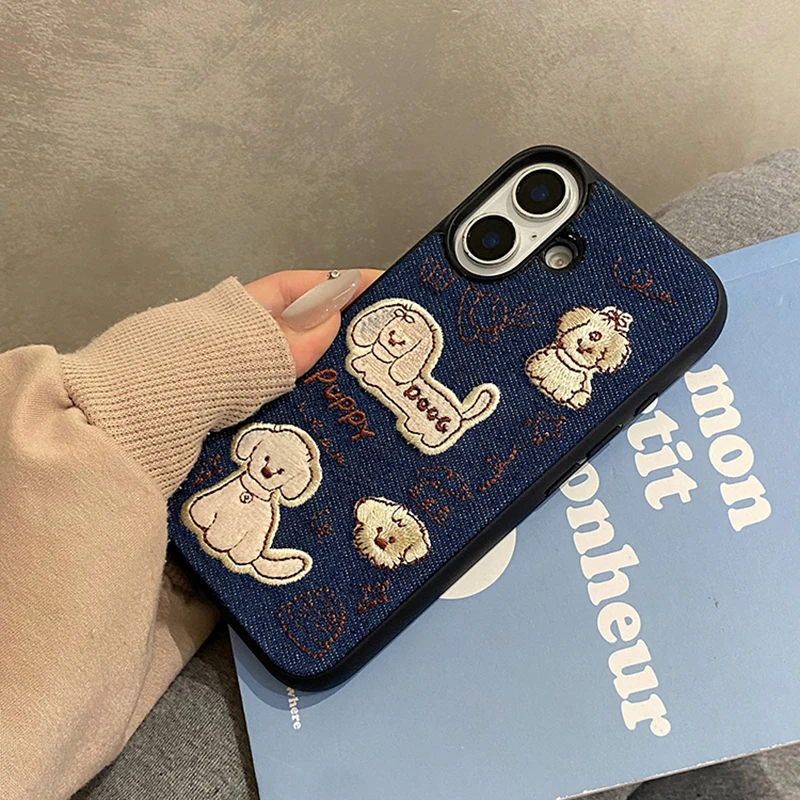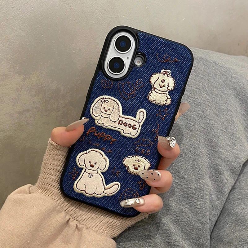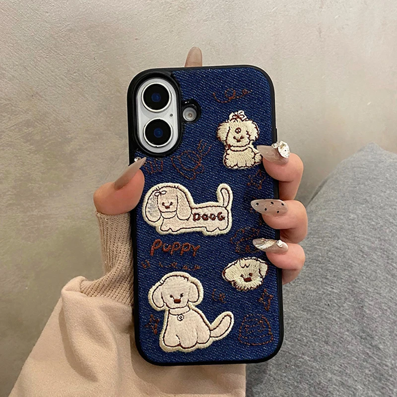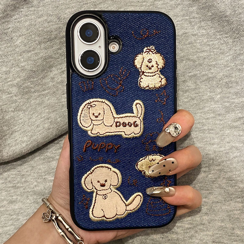 Cartoon Cute Embroidered Dog Phone Case For iPhone 16 Pro Max 15 13 14 12 11 Soft Silicone Denim Fabric Back Cover Shell