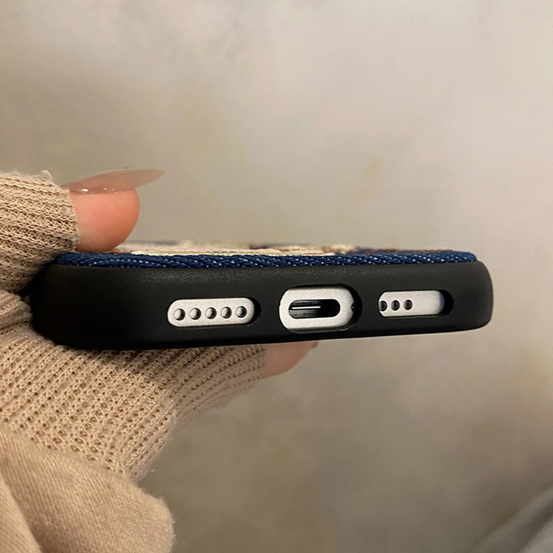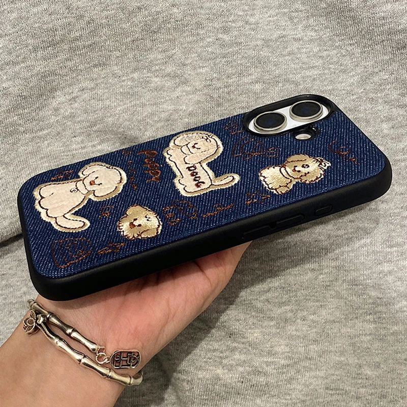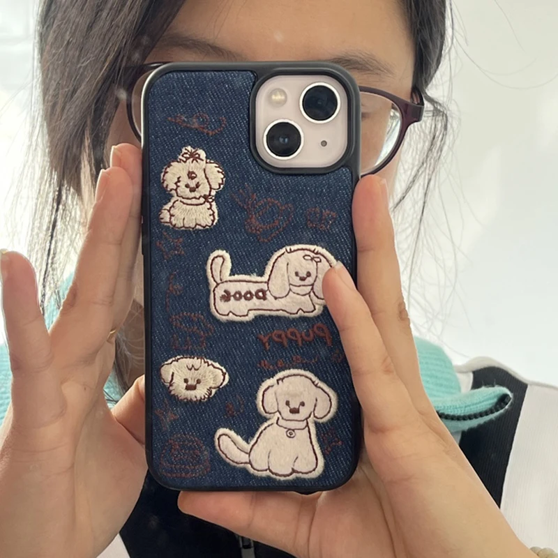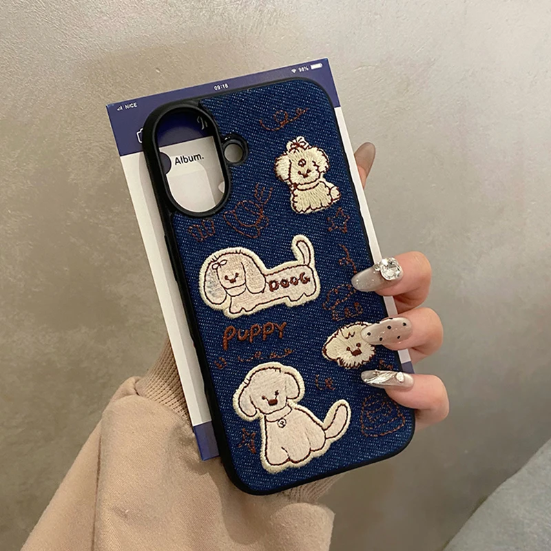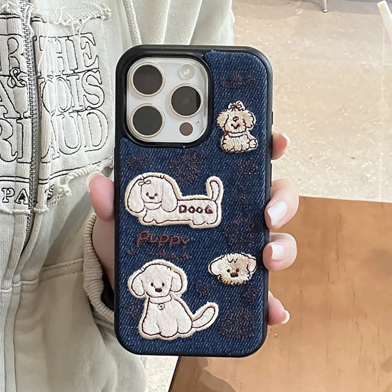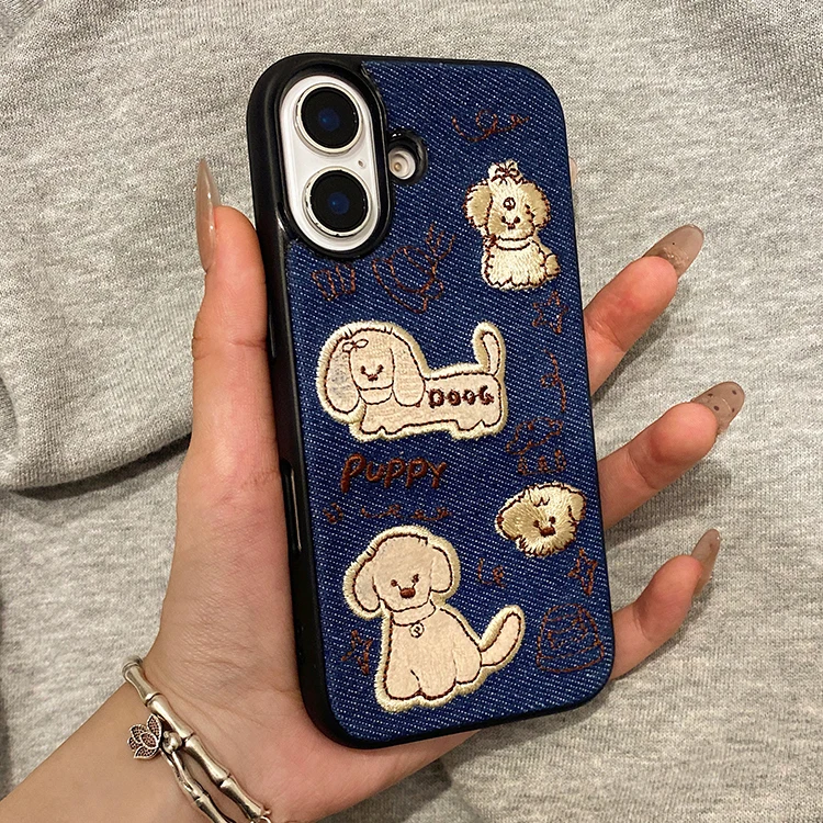 Cartoon Cute Embroidered Dog Phone Case For iPhone 16 Pro Max 15 13 14 12 11 Soft Silicone Denim Fabric Back Cover Shell