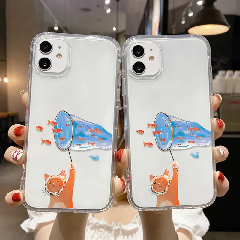 Shockproof Kitten Fishing Phone Case For iPhone 13 11 16 17 Pro Max 14 15 12 Air XR X Xs 7 8 Plus SE Soft Transparent Covers