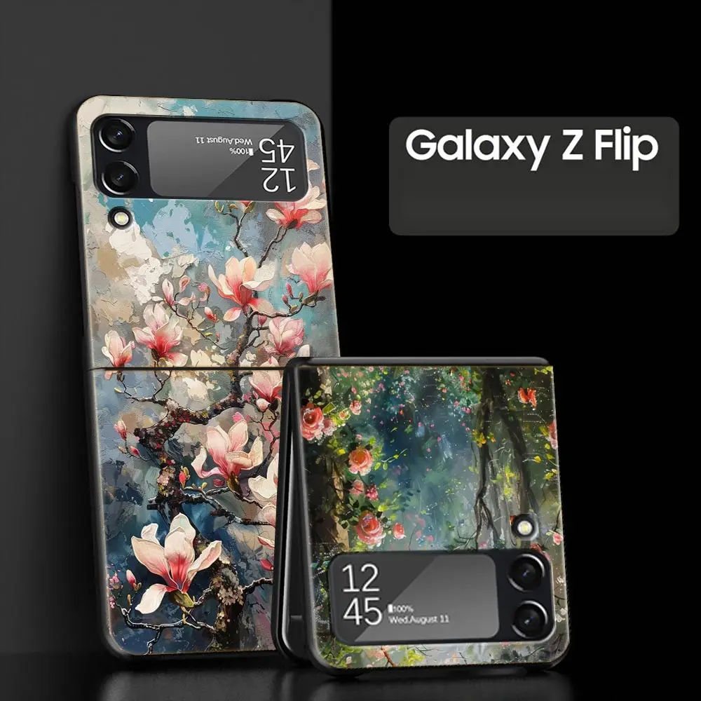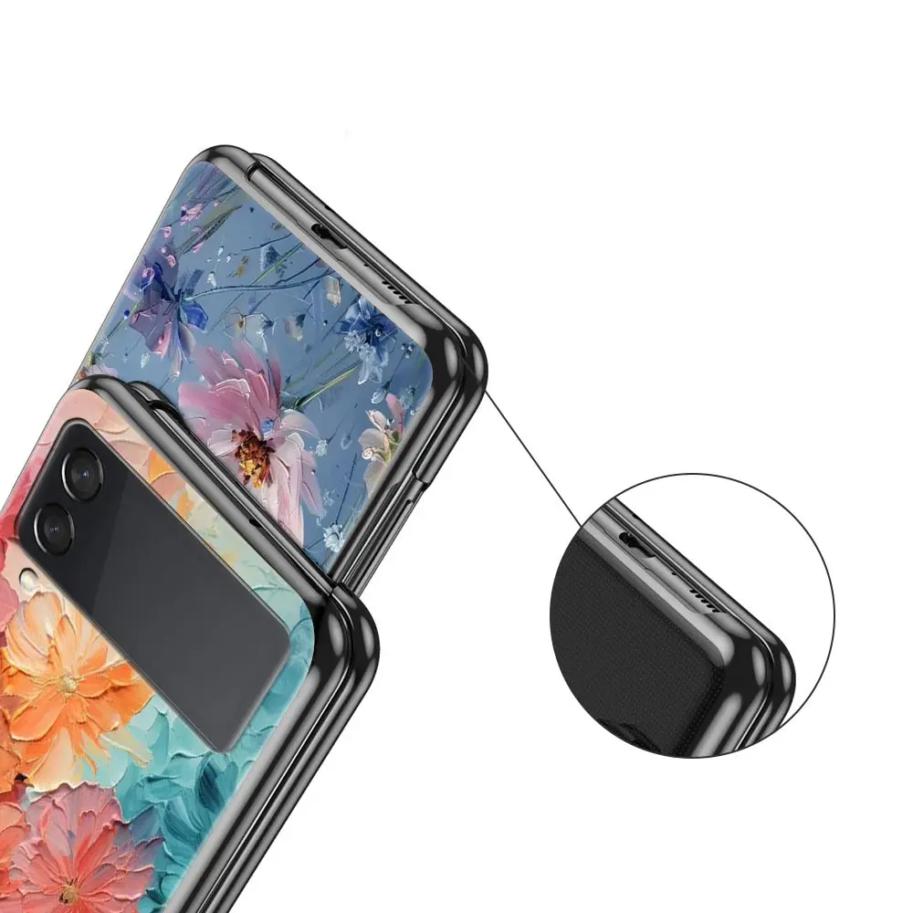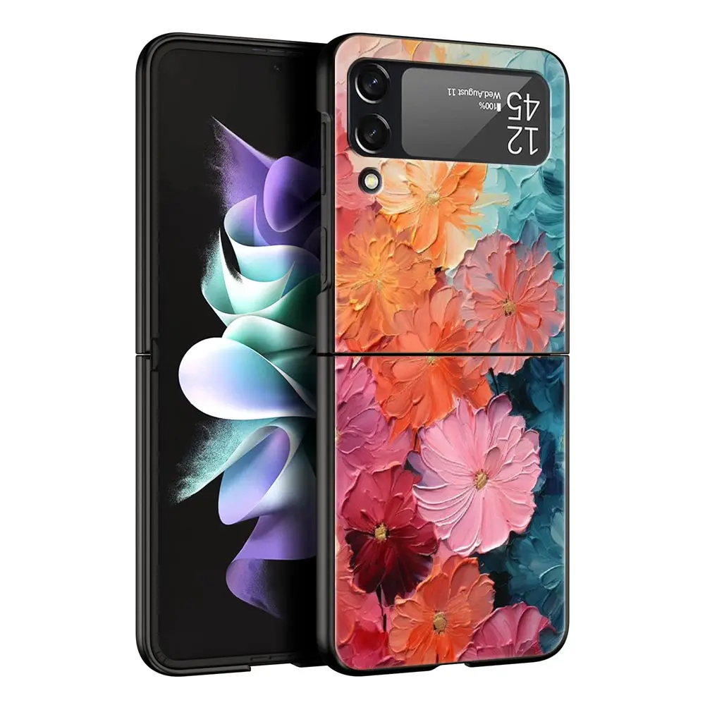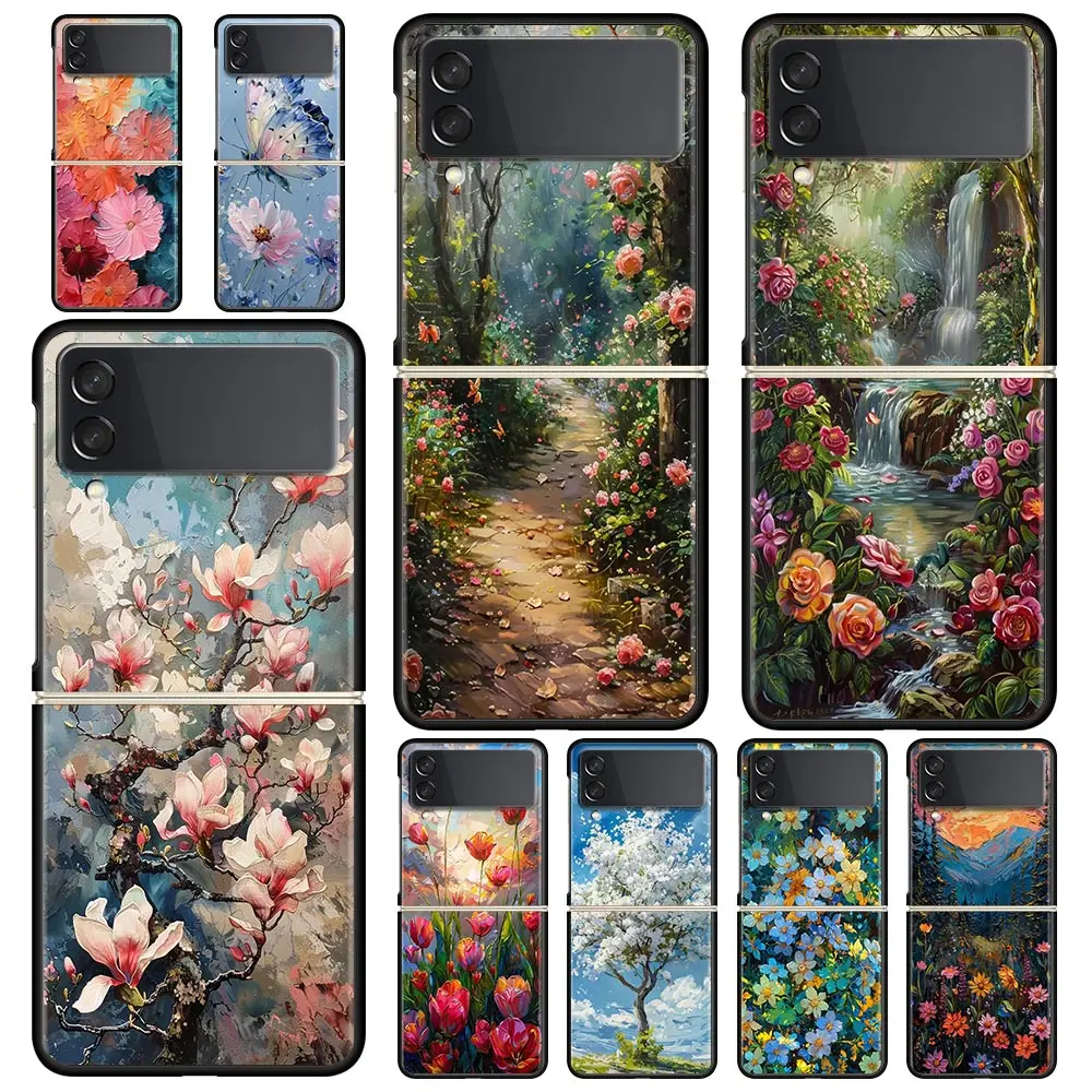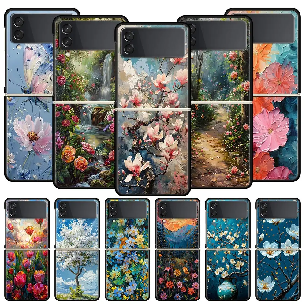Comprar Funda de teléfono con pintura al óleo de flores para Samsung Galaxy Z Flip3 Flip4 Flip5, carcasa para Z Flip 3 4 5 6, funda plegable dura negra