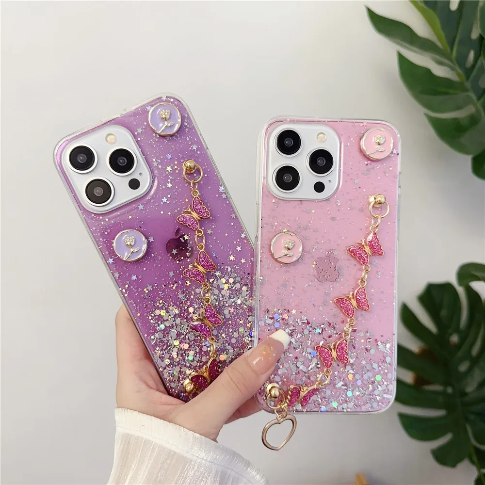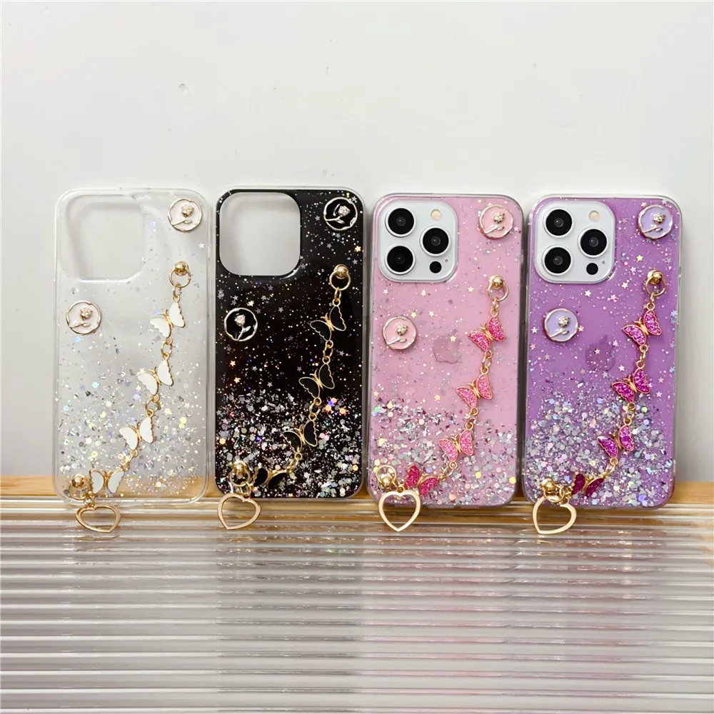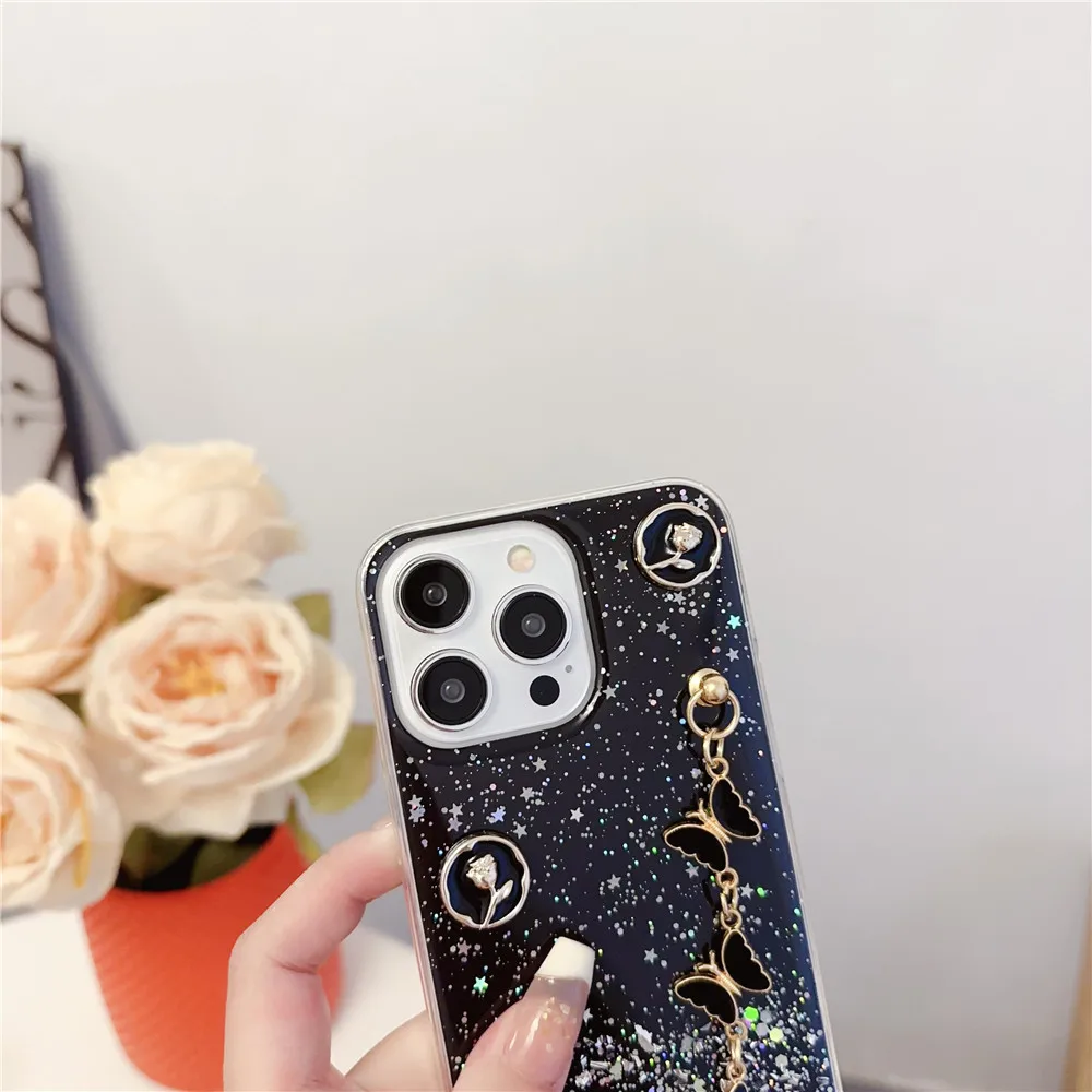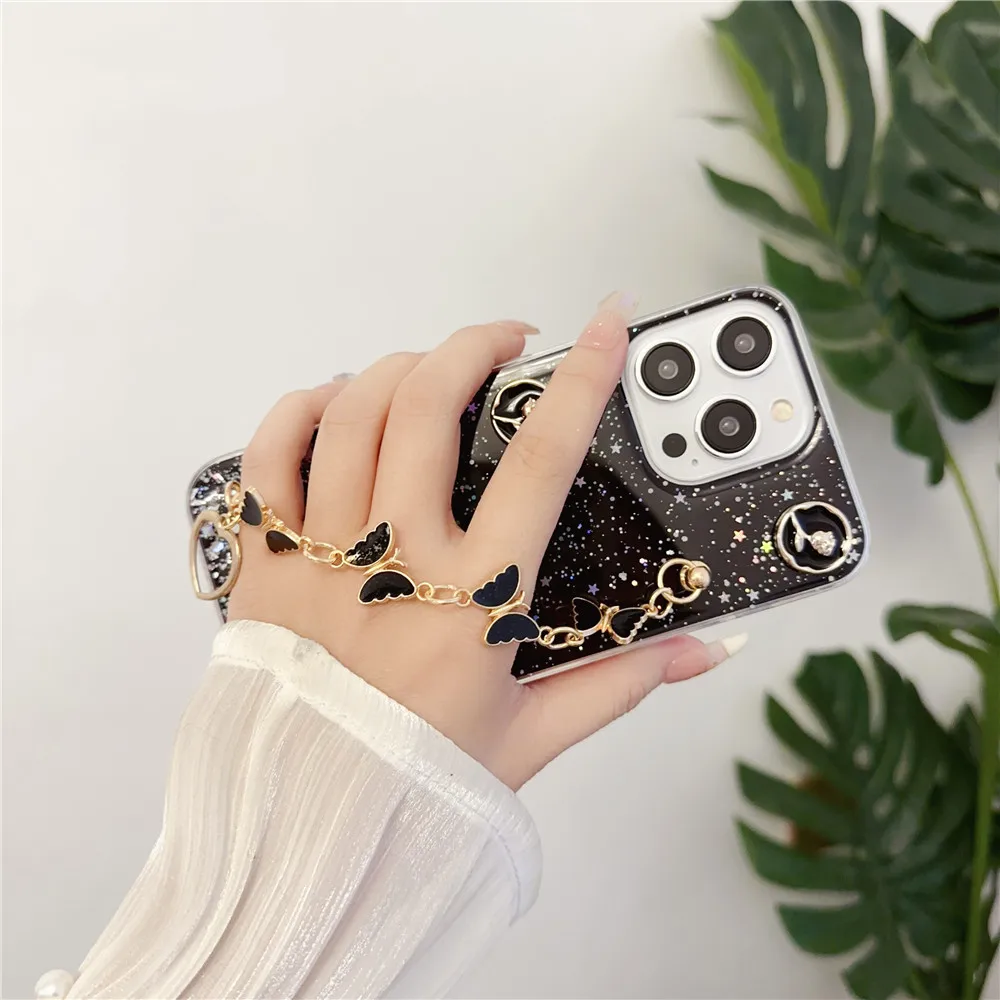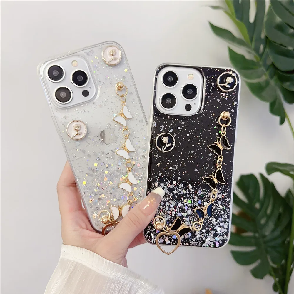 Funda de teléfono con pulsera de mariposa para Samsung S24 S23 S22 Ultra S21 Plus S20FE S10 Note 20, funda blanda transparente brillante con estrella brillante