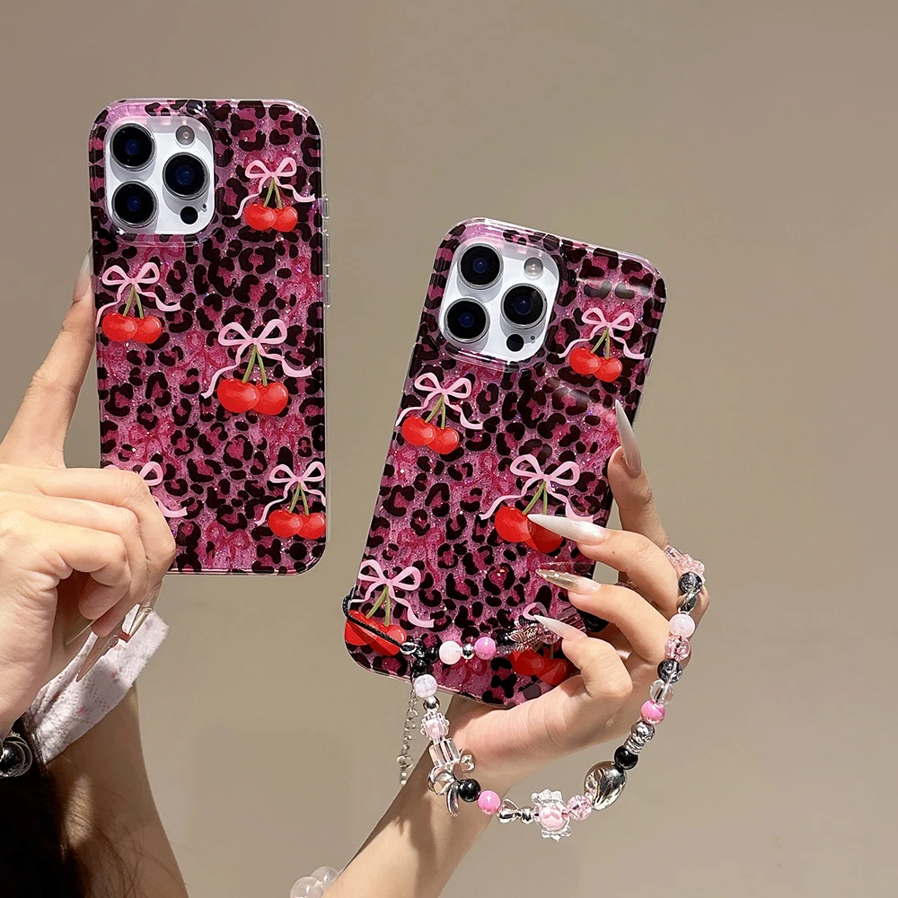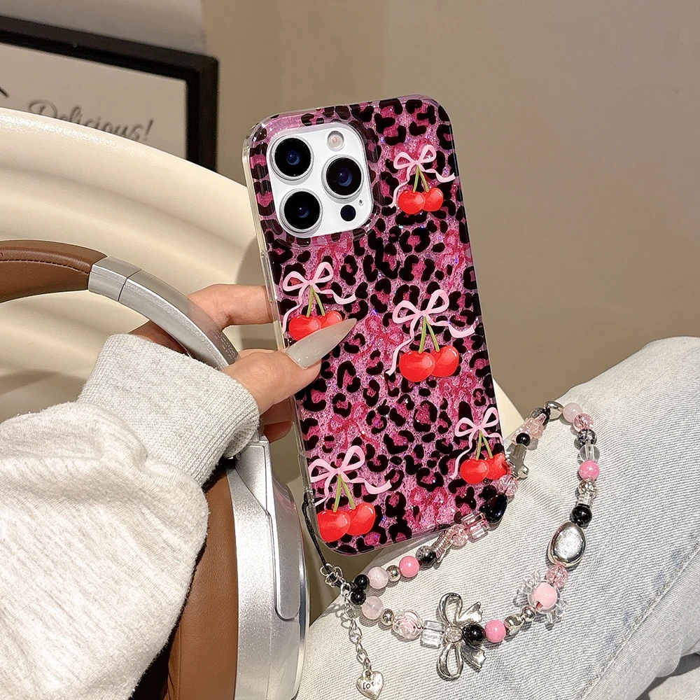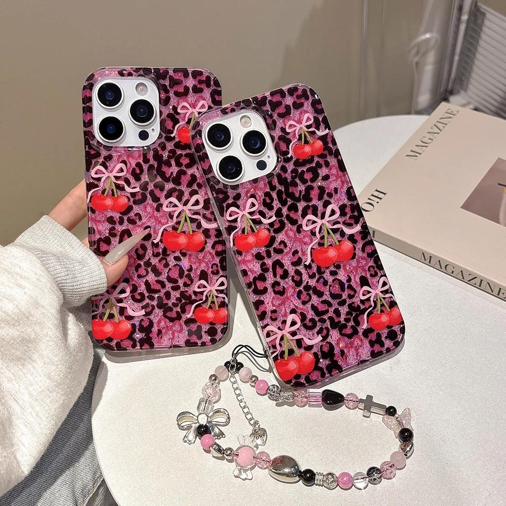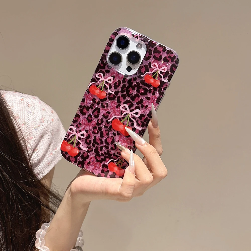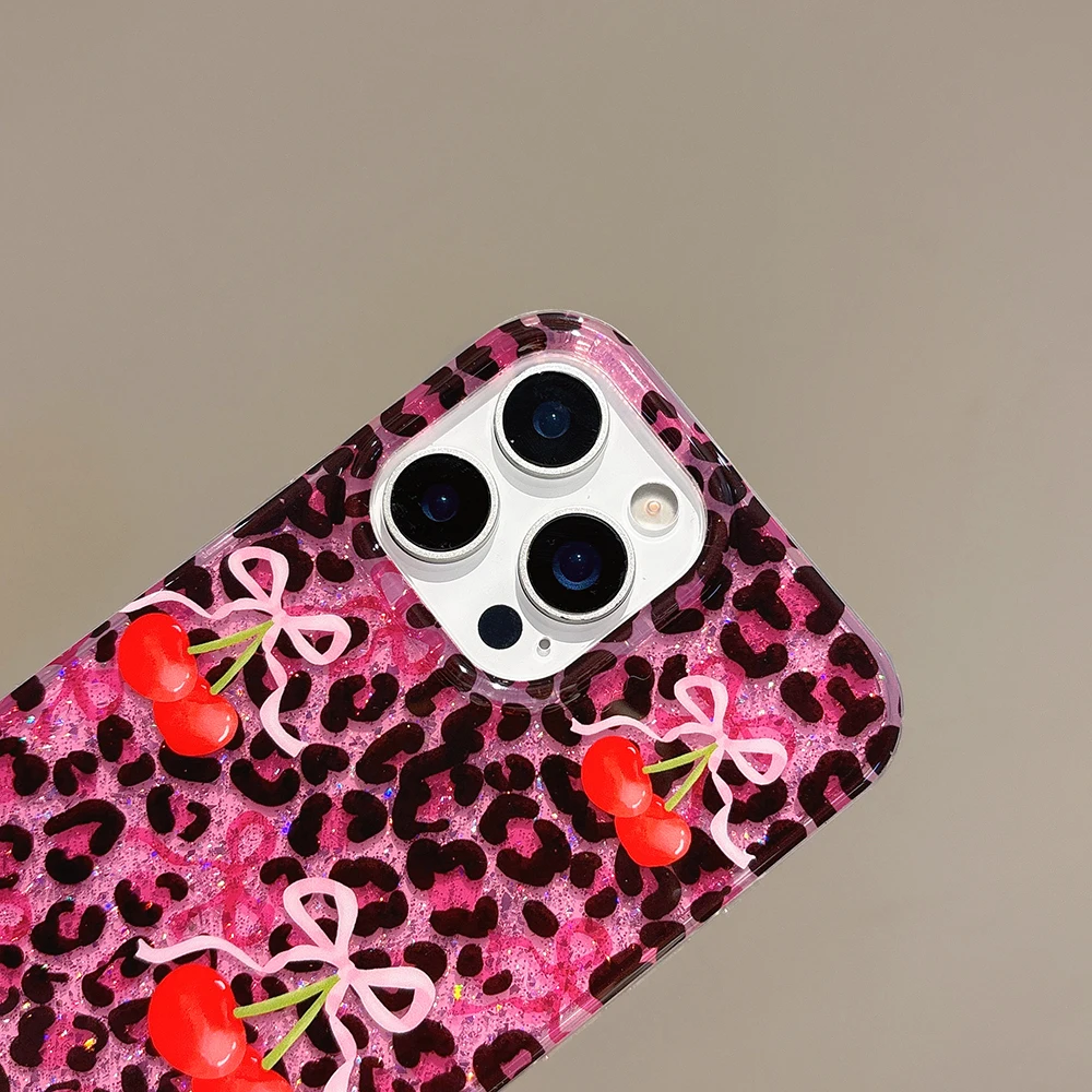 Funda de teléfono con estampado de leopardo rosa y cereza roja con purpurina para iPhone 13 15 14 16 Pro Max, funda ostentosa a prueba de golpes a la moda para Iphone 17 Pro