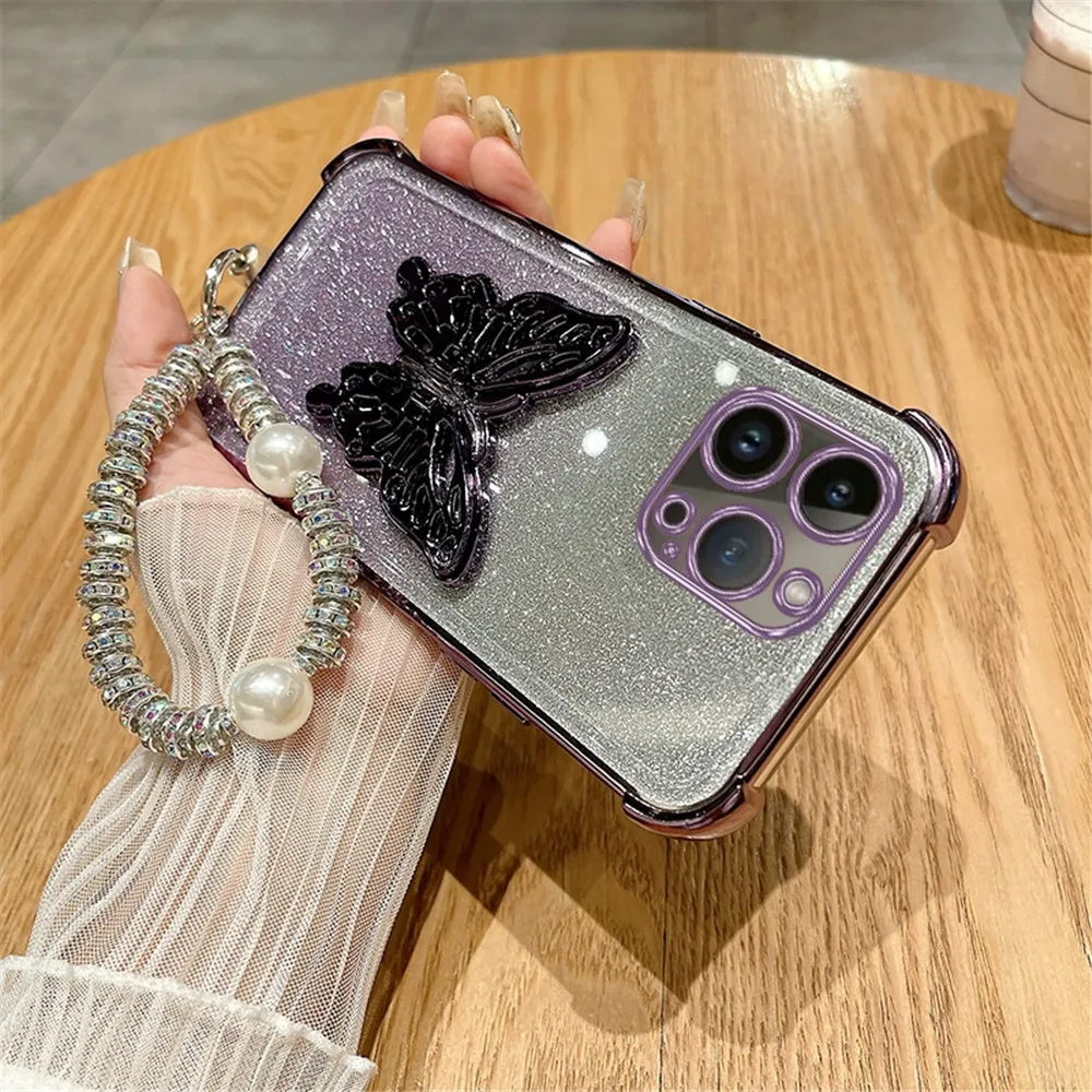 Comprar Funda de teléfono con purpurina chapada en soporte de mariposa para iPhone 16 15 14 13 11 12 Pro Max XS XR 7 8 Plus, funda a prueba de golpes con pulsera