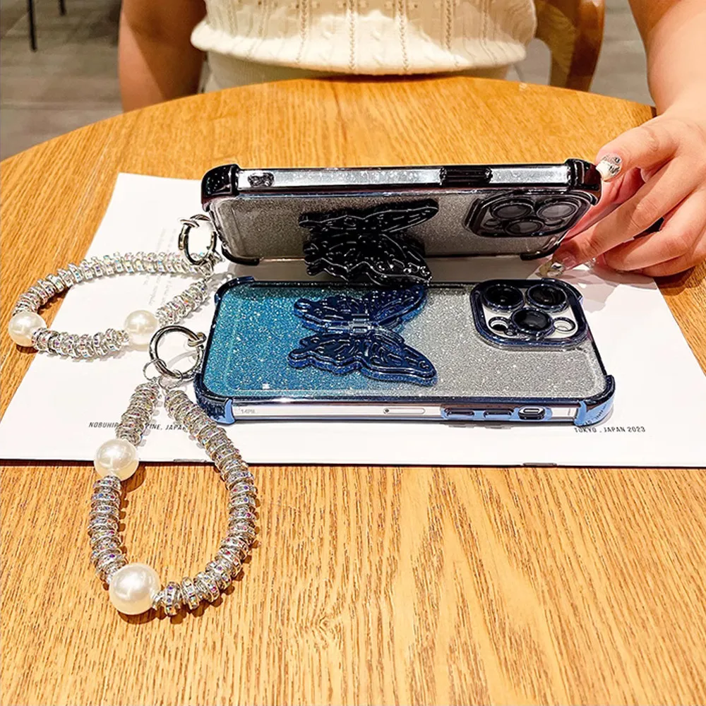 Butterfly Bracket Plating Glitter Phone Case For iPhone 16 15 14 13 11 12 Pro Max XS XR 7 8 Plus Shockproof Cover With Bracelet