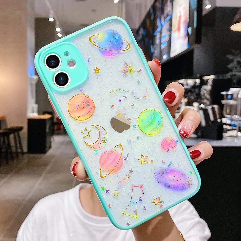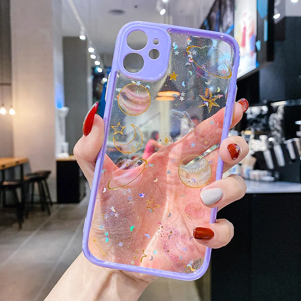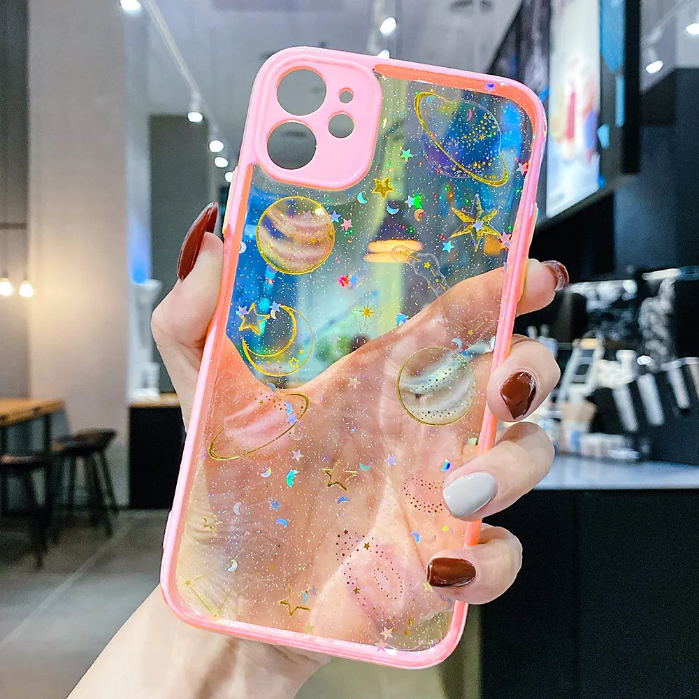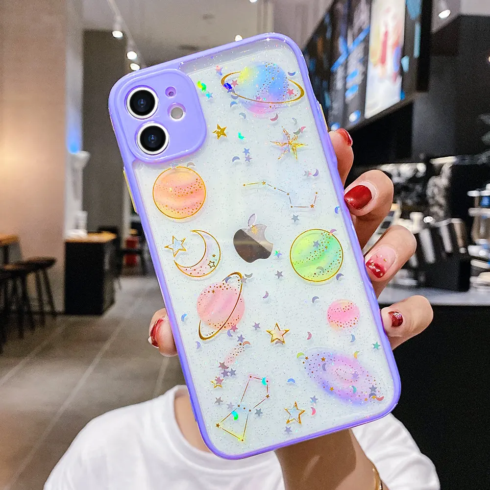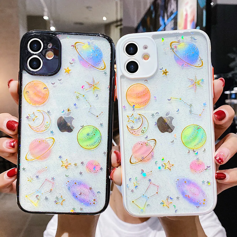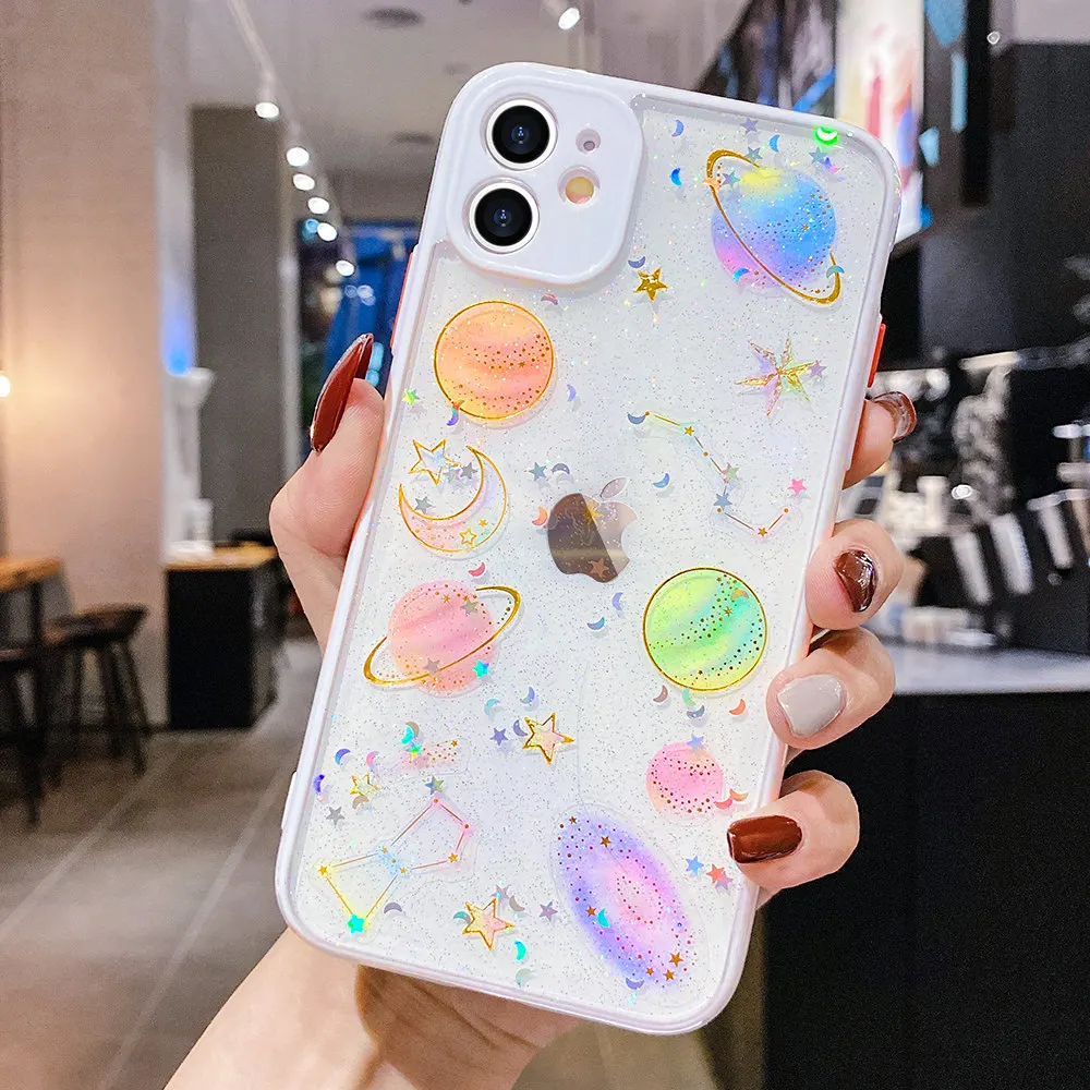 Comprar Funda de teléfono con purpurina espacial epoxi para IPhone 12 Mini, 11 Pro Max, Xr, X, Xs, 8, 7 Plus, SE2020, transparente, Planeta, Estrella, funda de silicona delgada