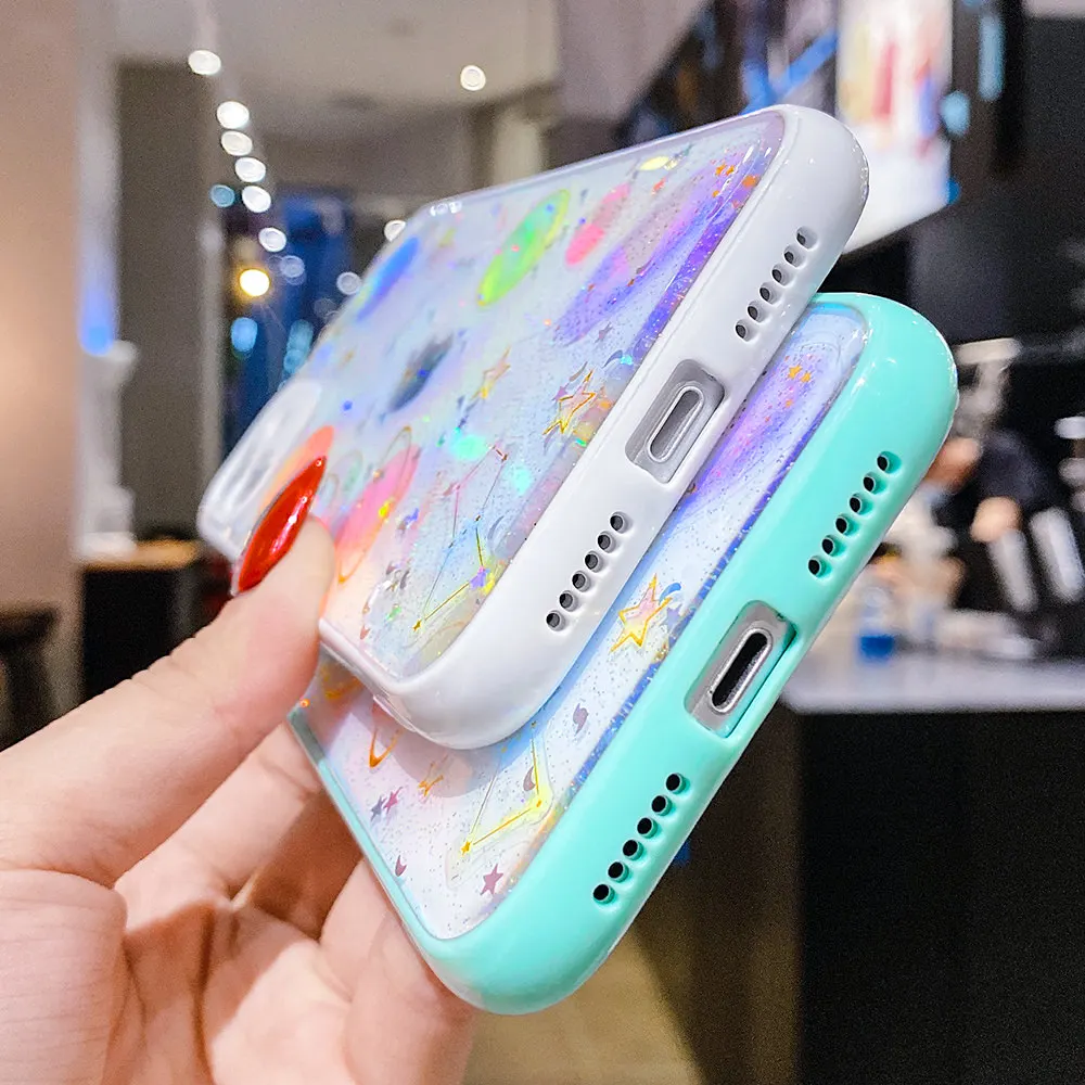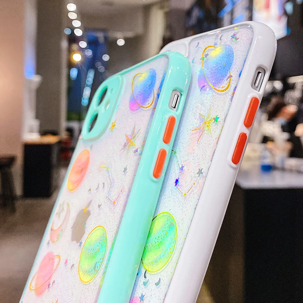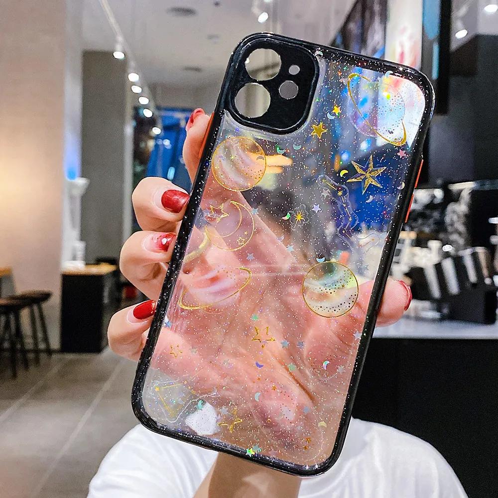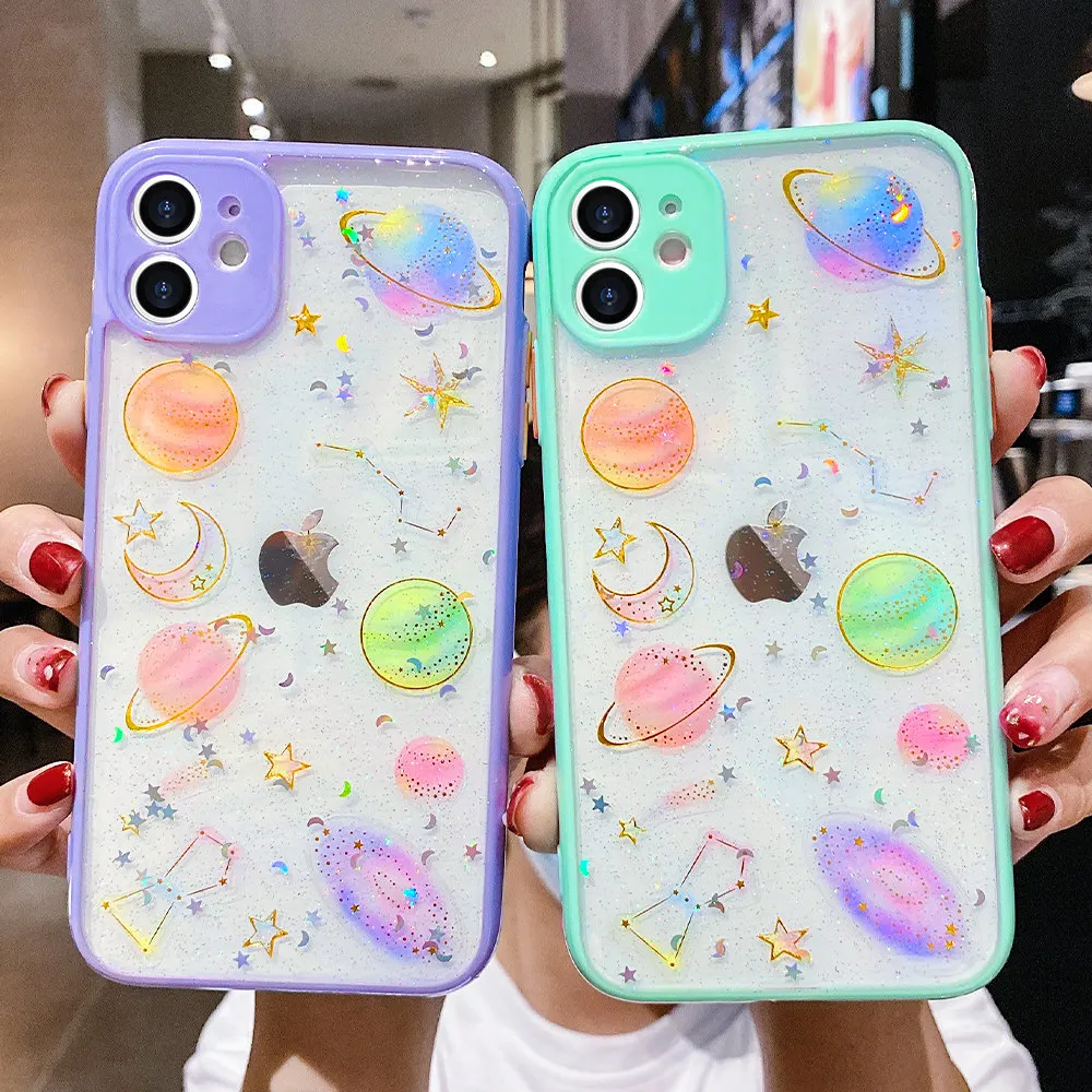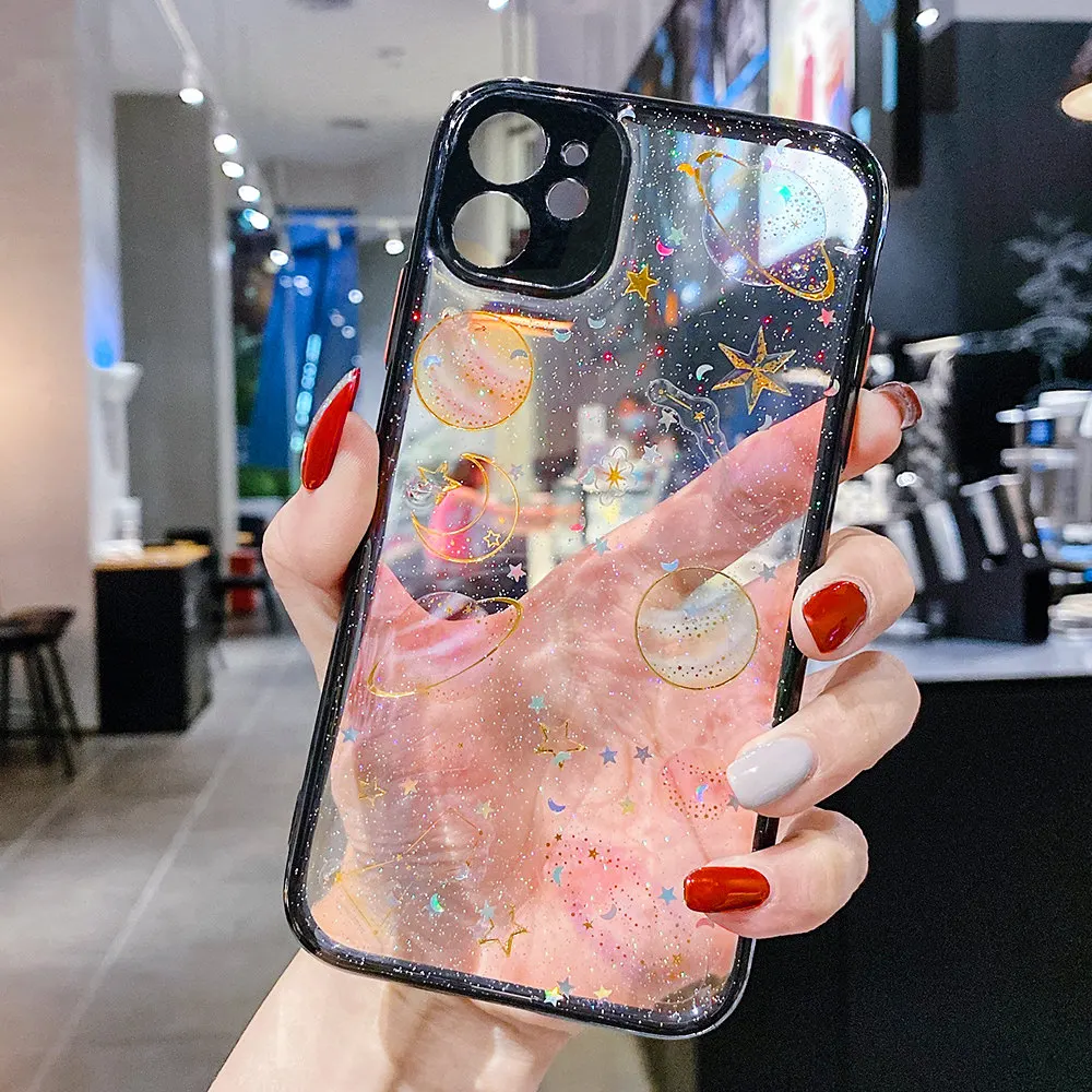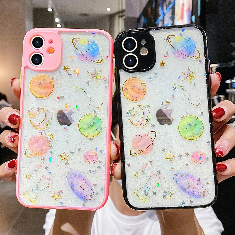 Comprar Funda de teléfono con purpurina espacial epoxi para IPhone 12 Mini, 11 Pro Max, Xr, X, Xs, 8, 7 Plus, SE2020, transparente, Planeta, Estrella, funda de silicona delgada