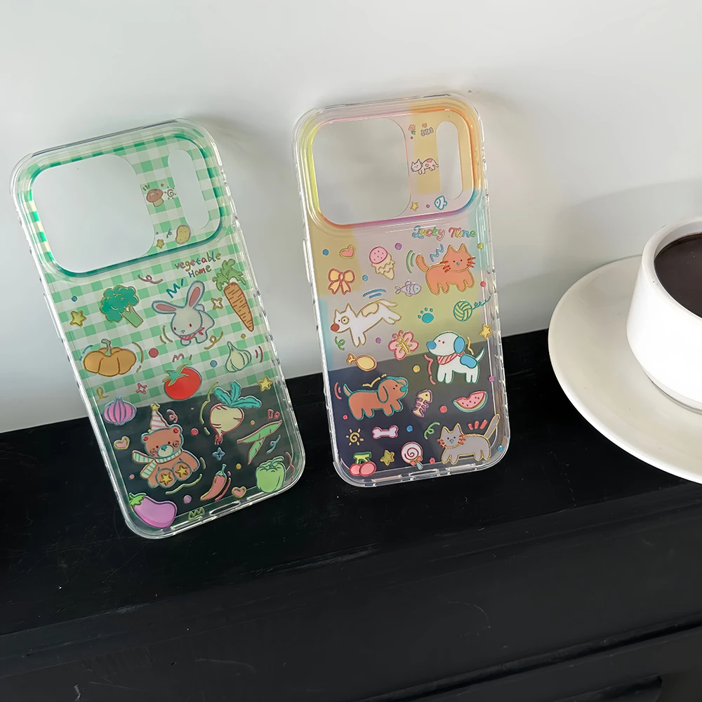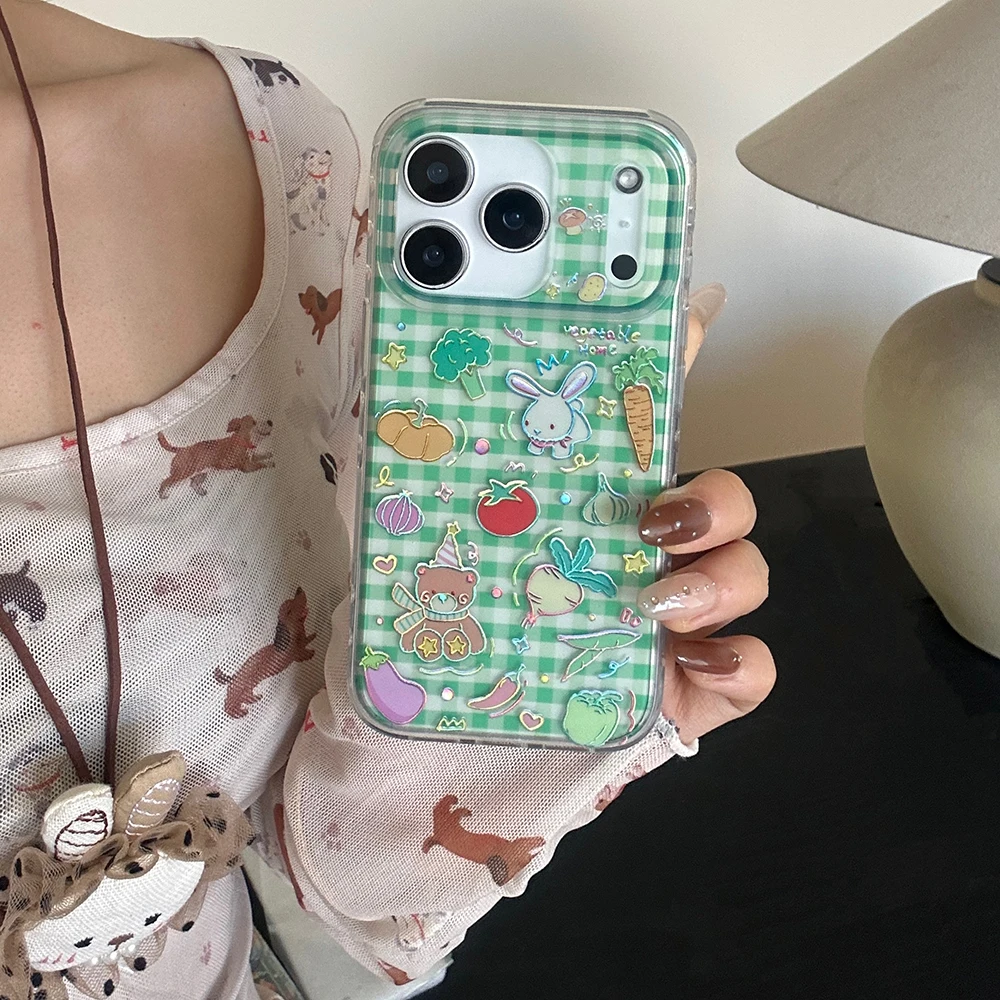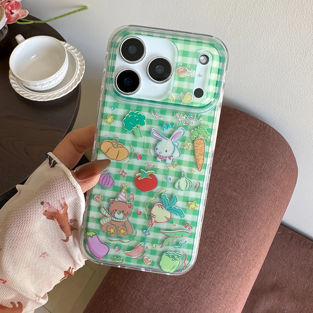 Funda de teléfono con purpurina láser de dibujos animados, diseño de rejilla verde y Animal bonito para iPhone 13 14 16 15 17 Pro 17ProMax, funda transparente a prueba de golpes