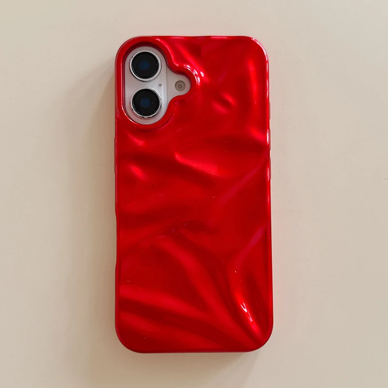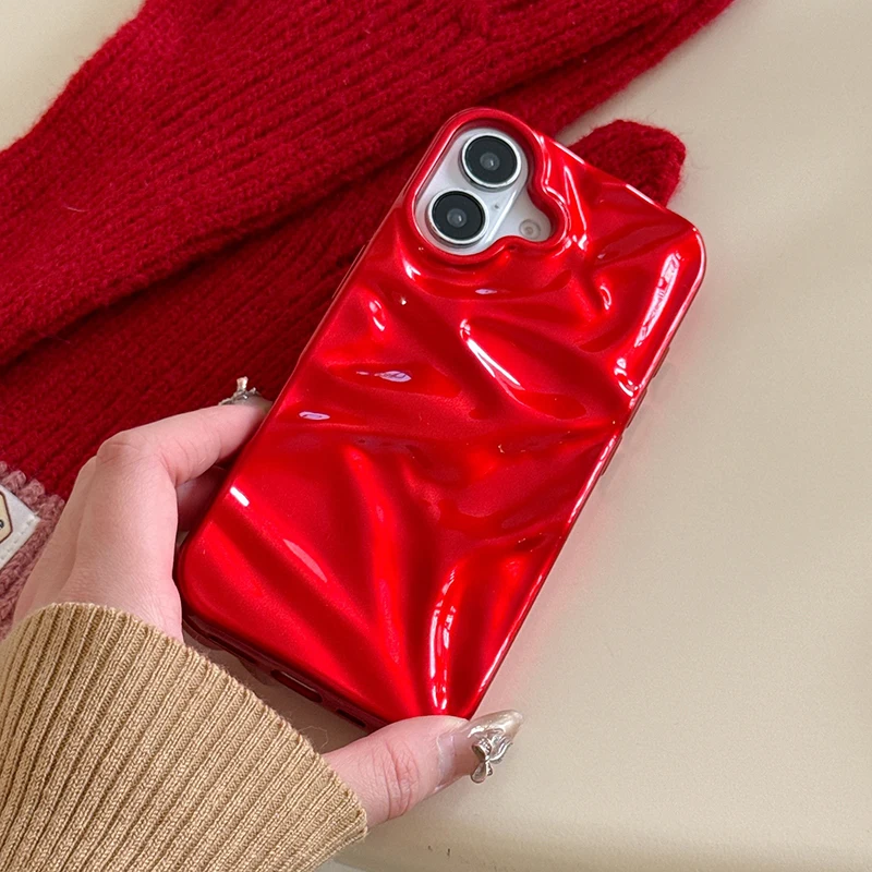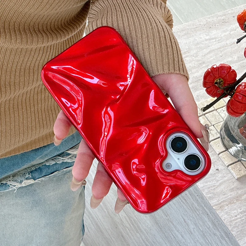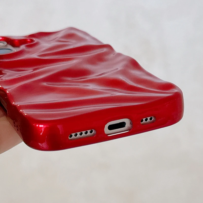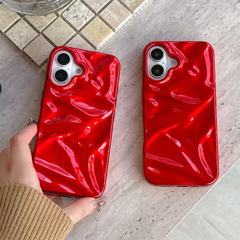 Red Glossy Irregular Wrinkle Phone Case For iPhone 16 Pro Max 15 13 12 11 14 Plus Soft Silicone Protective Back Cover