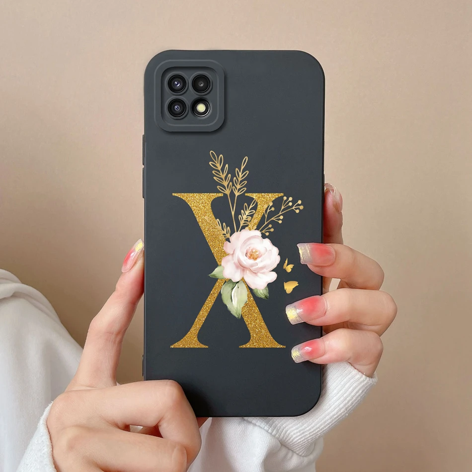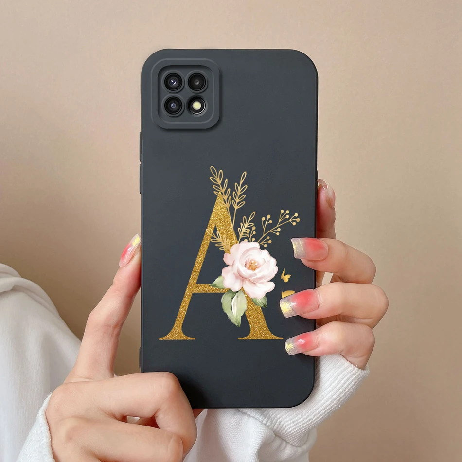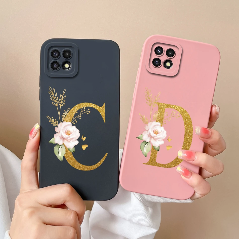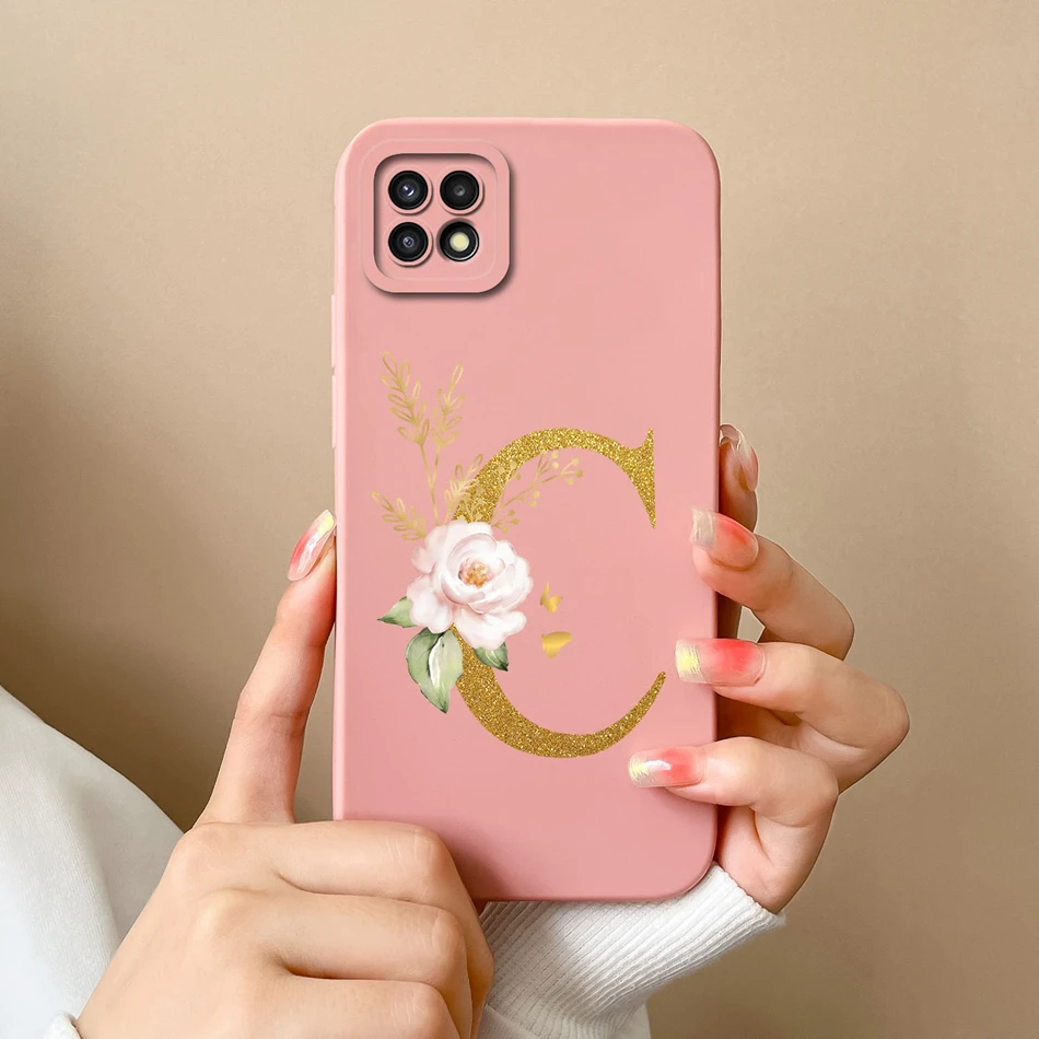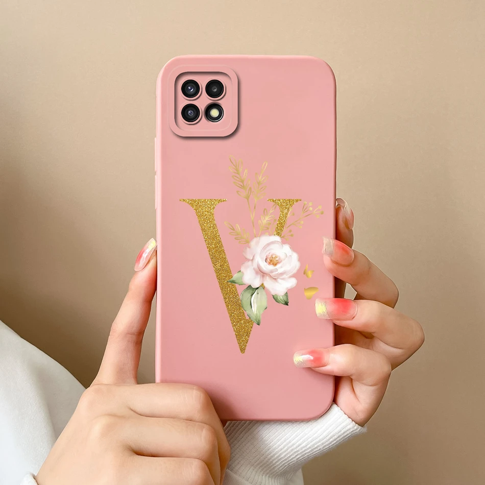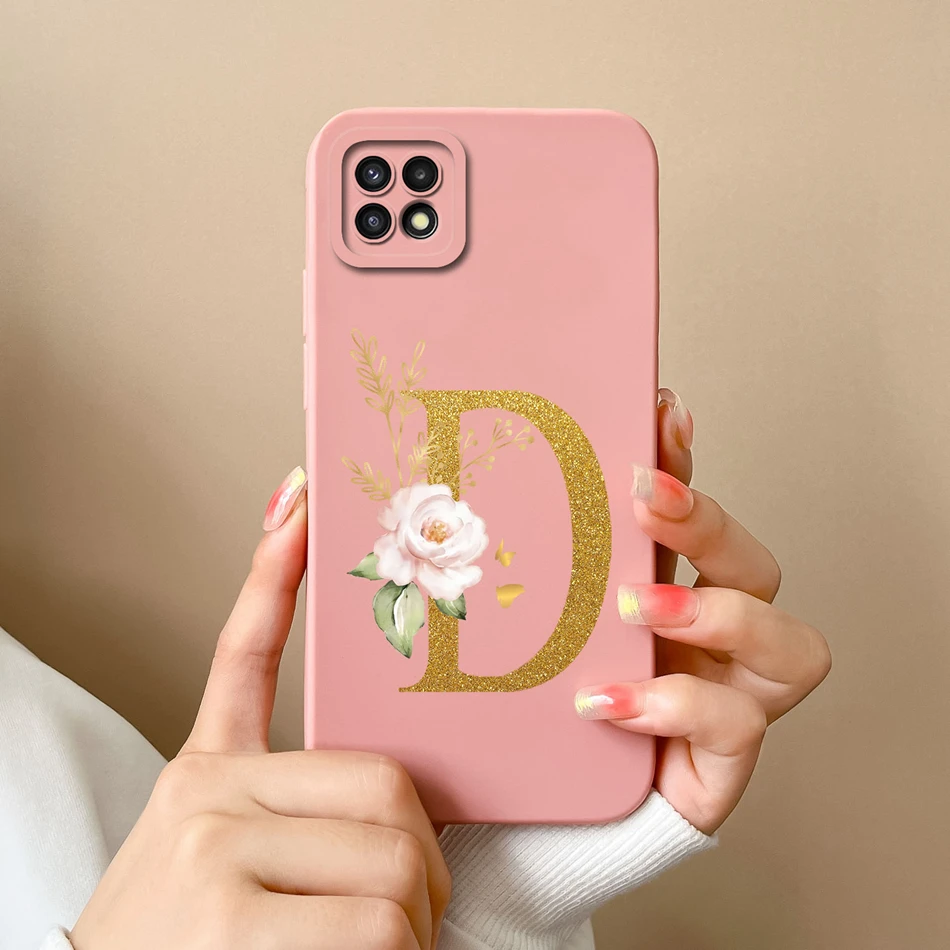 Comprar Funda de teléfono para Samsung A22 A22S, cubierta protectora de lente de silicona líquida suave con letras rosas elegantes para Galaxy A22 A 22S, parachoques