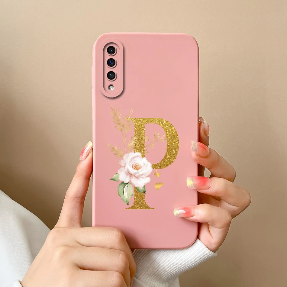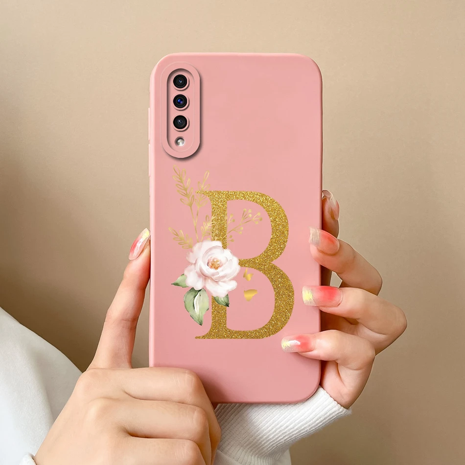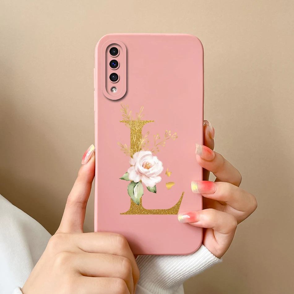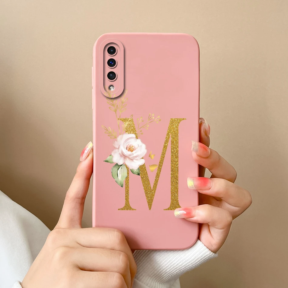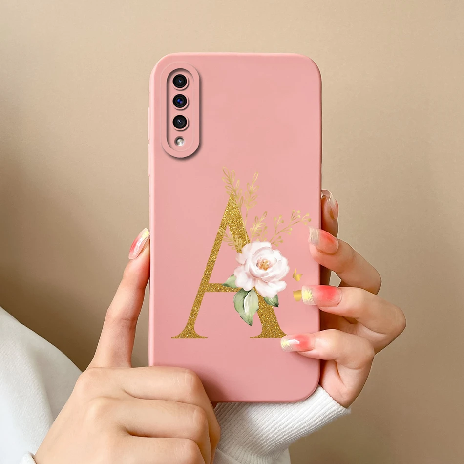 Comprar Funda de teléfono para Samsung A50 A50S, cubierta protectora de lente de silicona líquida suave con letras rosas elegantes para Galaxy A 50 A 50S, regalo de parachoques
