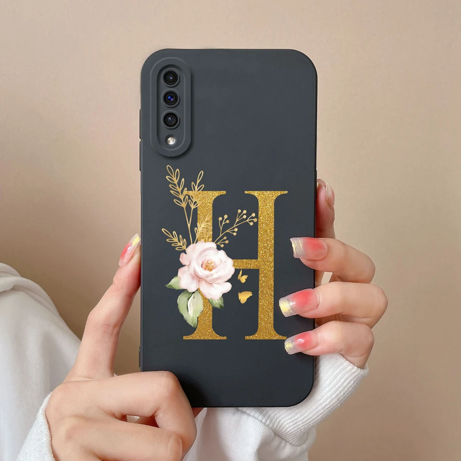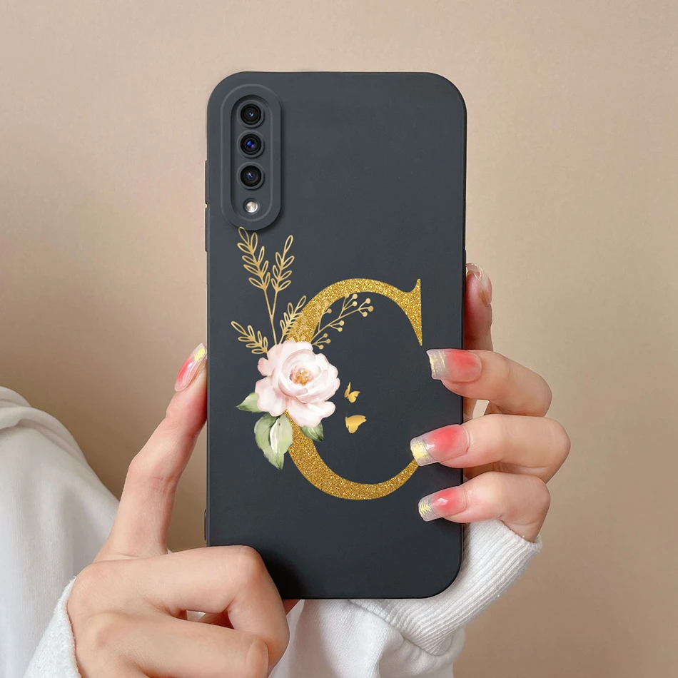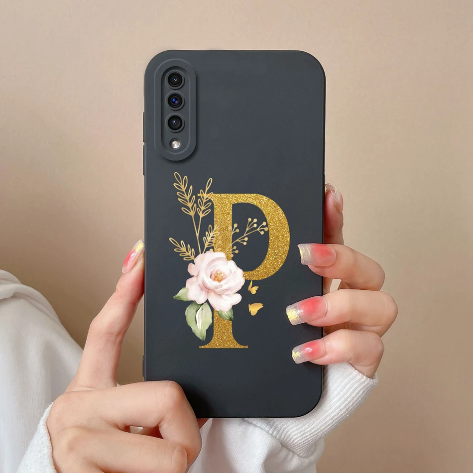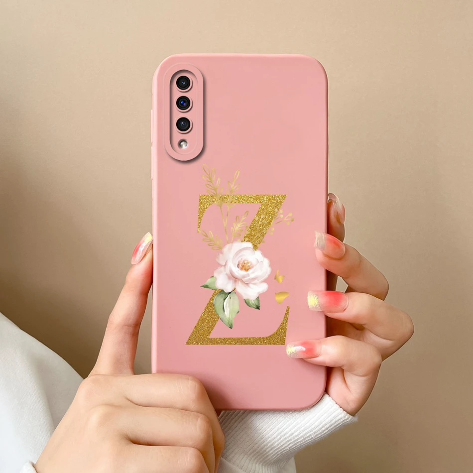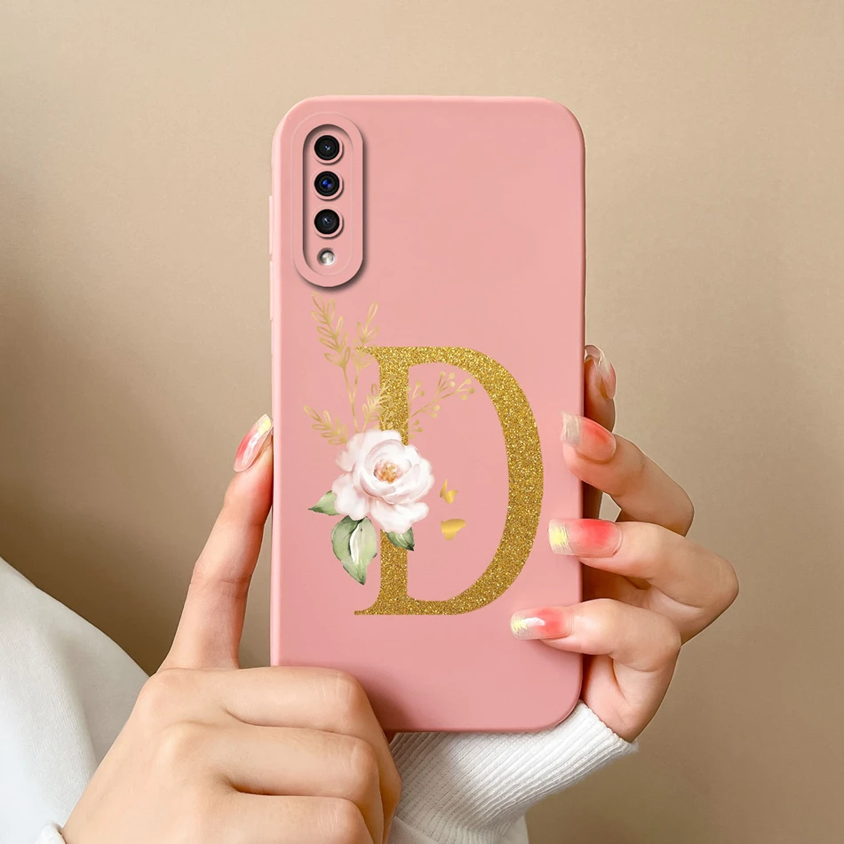 Comprar Funda de teléfono para Samsung A50 A50S, cubierta protectora de lente de silicona líquida suave con letras rosas elegantes para Galaxy A 50 A 50S, regalo de parachoques