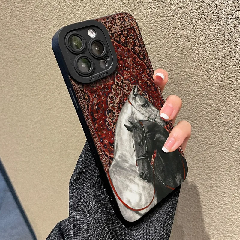 Funda de teléfono de silicona con diseño de caballo blanco y negro Vintage para iPhone 11 12 13 14 15 16 17 Pro Max XS XR X 7 8 Plus 16E Air Cover