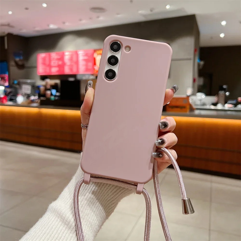 Comprar Funda de teléfono de silicona mate con correa cruzada, carcasa trasera a prueba de golpes, Color sólido, para Samsung S24, S23, Ultra FE, S21, S22 Plus