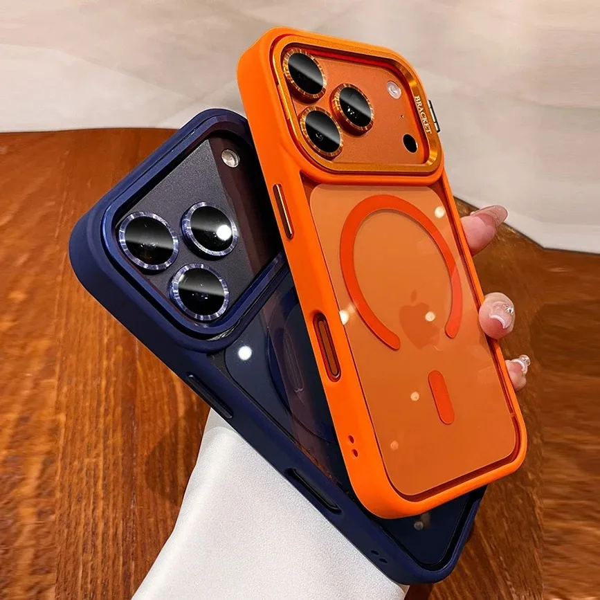 Funda de teléfono con soporte de lente magnética Magsafe de lujo para iPhone 17 16 15 14 13 12 Pro Max Plus, fundas de carga inalámbrica con cordón de aire, funda para iphone 17 16 15 pro max