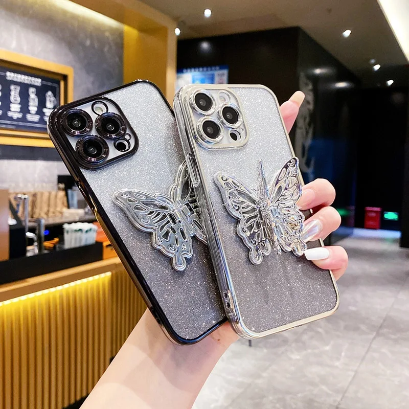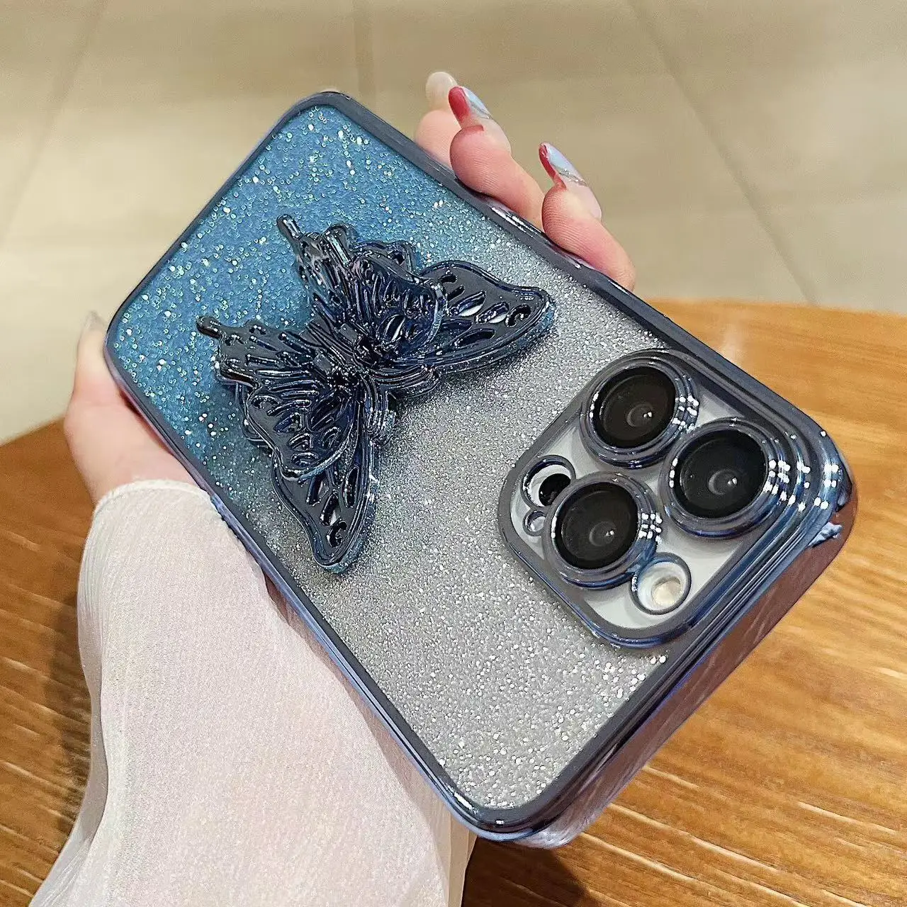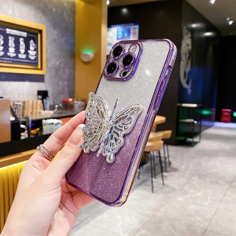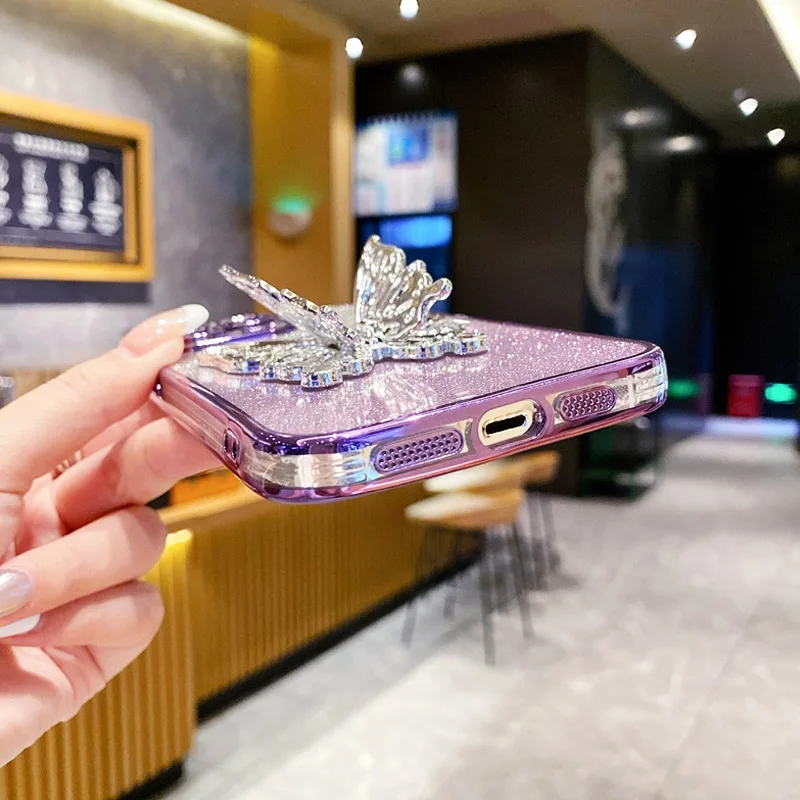 Funda de teléfono con soporte de mariposa chapada con purpurina para Oppo Reno11F Reno 12 10 11 12F 11F 9 7 6 5 Find X7 X3 Pro X5 Lite, funda con soporte