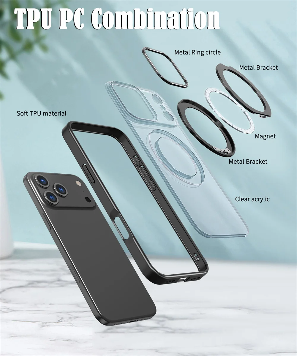 Funda de teléfono con soporte plegable y anillo magnético giratorio de lujo para iPhone 17 Air 15 16 Pro Max 14 13 12 11, Protector de lente, cubierta acrílica transparente