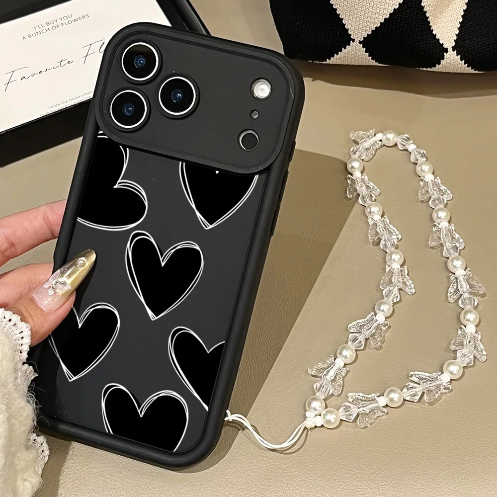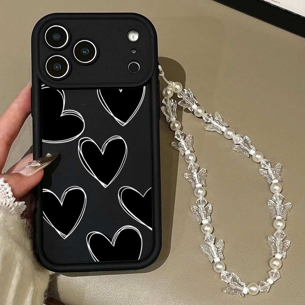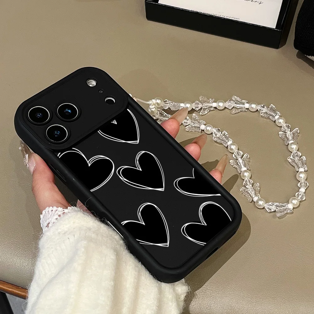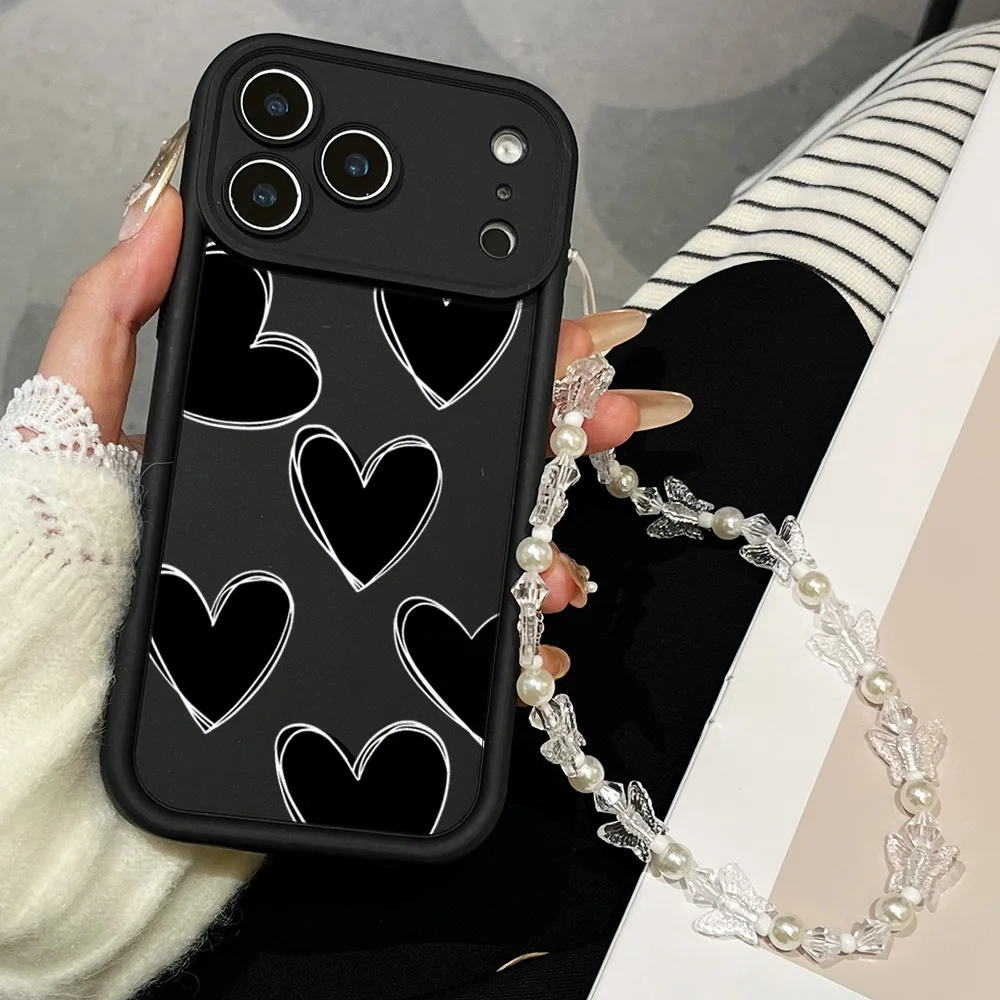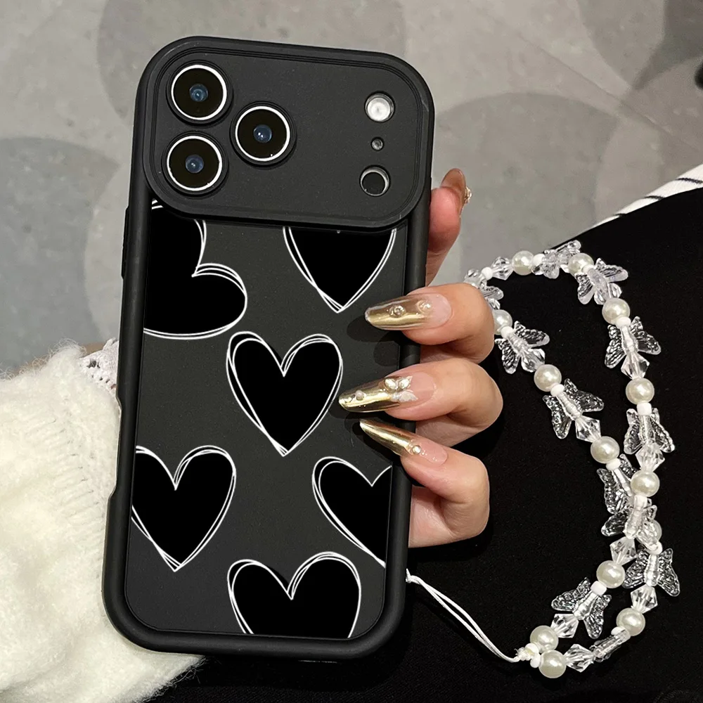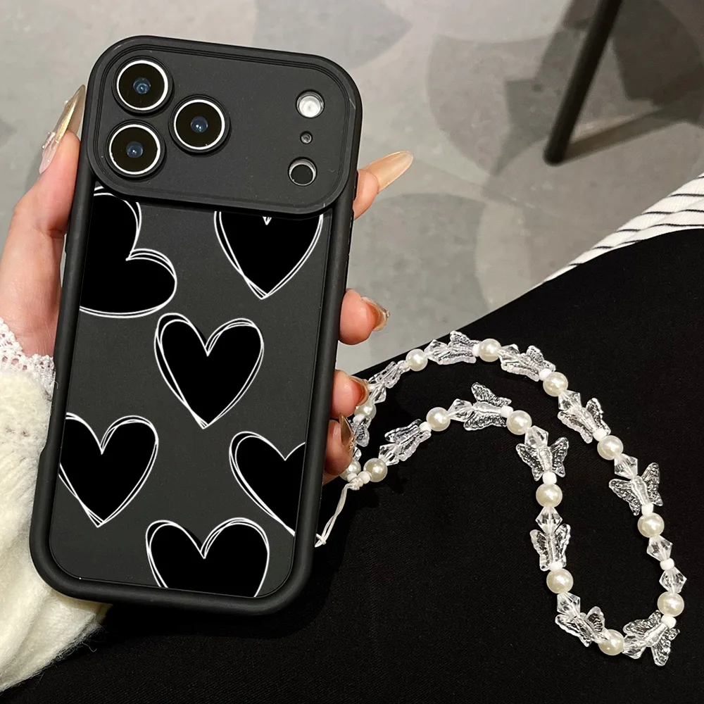 Funda de teléfono suave con patrón de corazón de amor negro para iPhone 17 16 15 14 13 12 11 Pro Max 16e 17Air X XR XS 7 8 Plus con funda con cordón