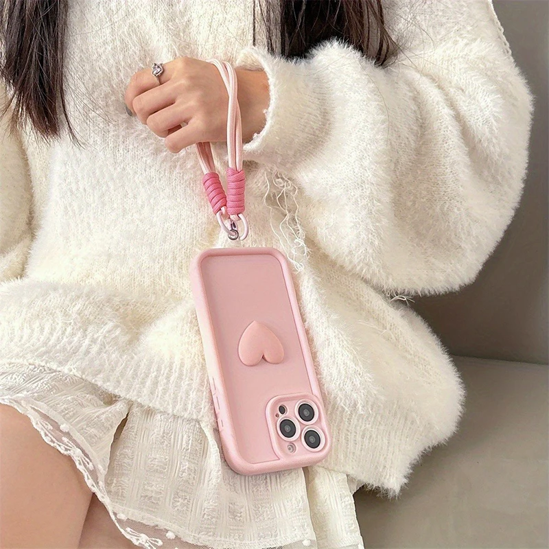 Funda de teléfono suave de silicona con corazón de amor rosa 3D para iPhone 11 12 13 14 15 17 Pro Max 16E XS XR X 7 8 Plus con funda de cuerda con cordón