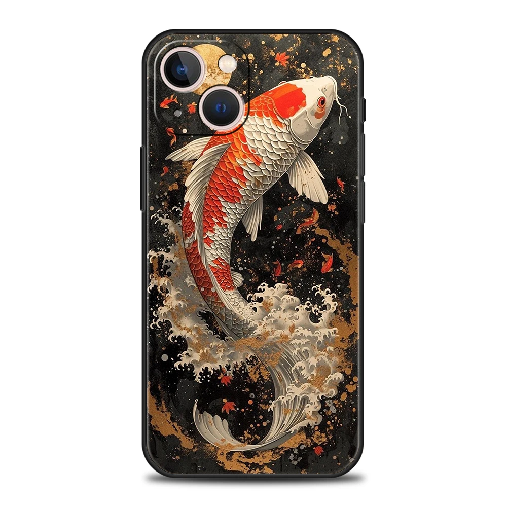 Comprar Funda de teléfono suave de TPU de lujo para iPhone 16 11 15 14 Pro MAX 12 13 7 8 Plus X XR XS SE 2022 cubierta negra Koi Carp