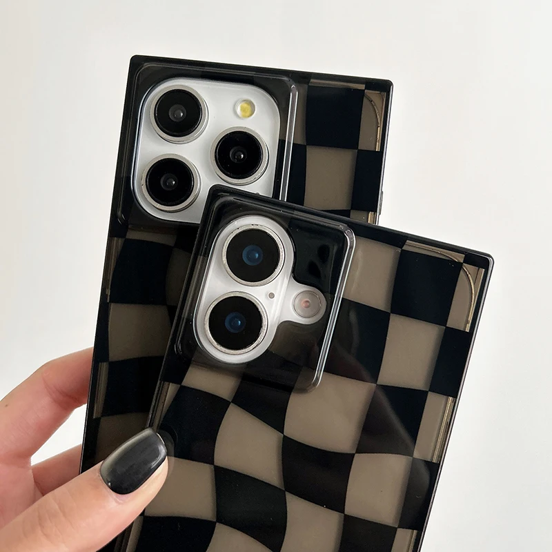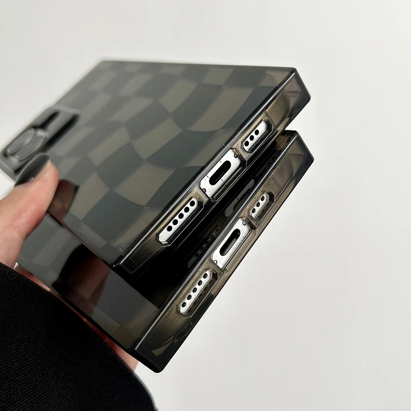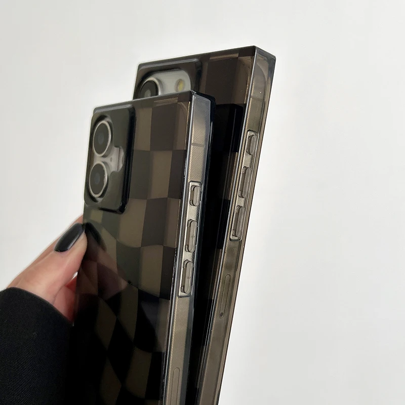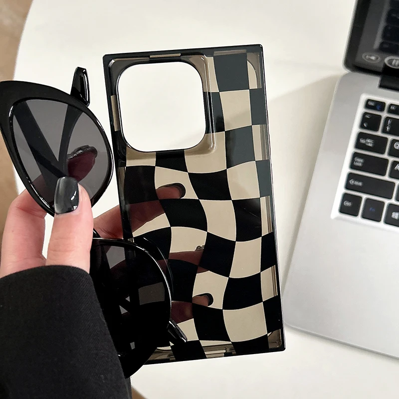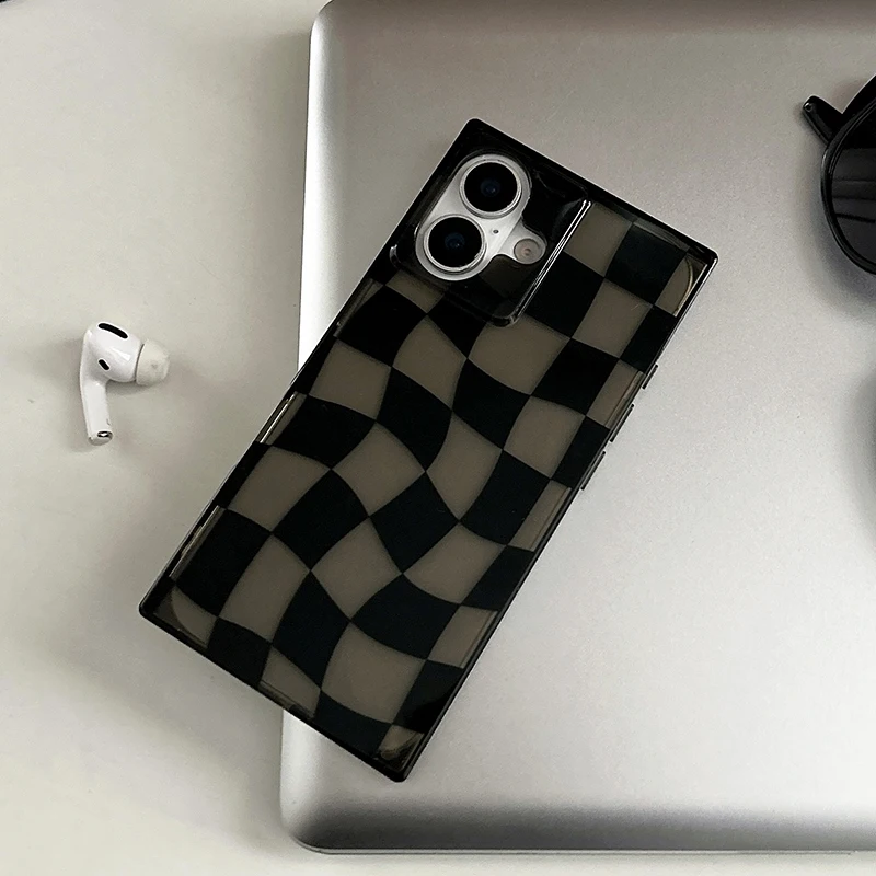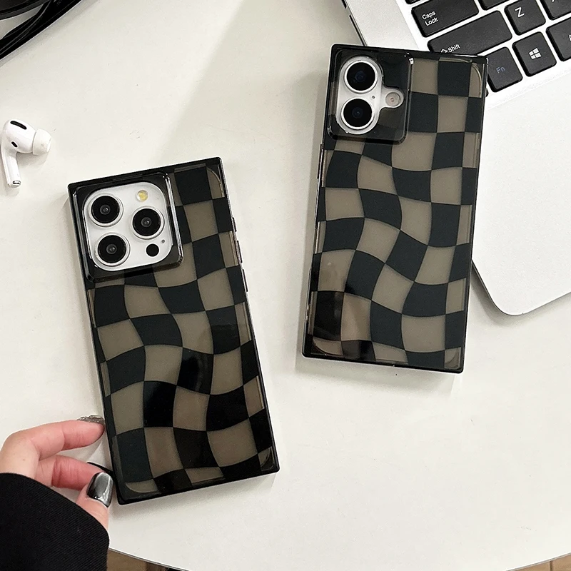 Funda de teléfono de tablero de ajedrez trenzado negro con borde Rectangular para iPhone 16 15 13 14 12 Pro Max, funda trasera dura transparente de TPU