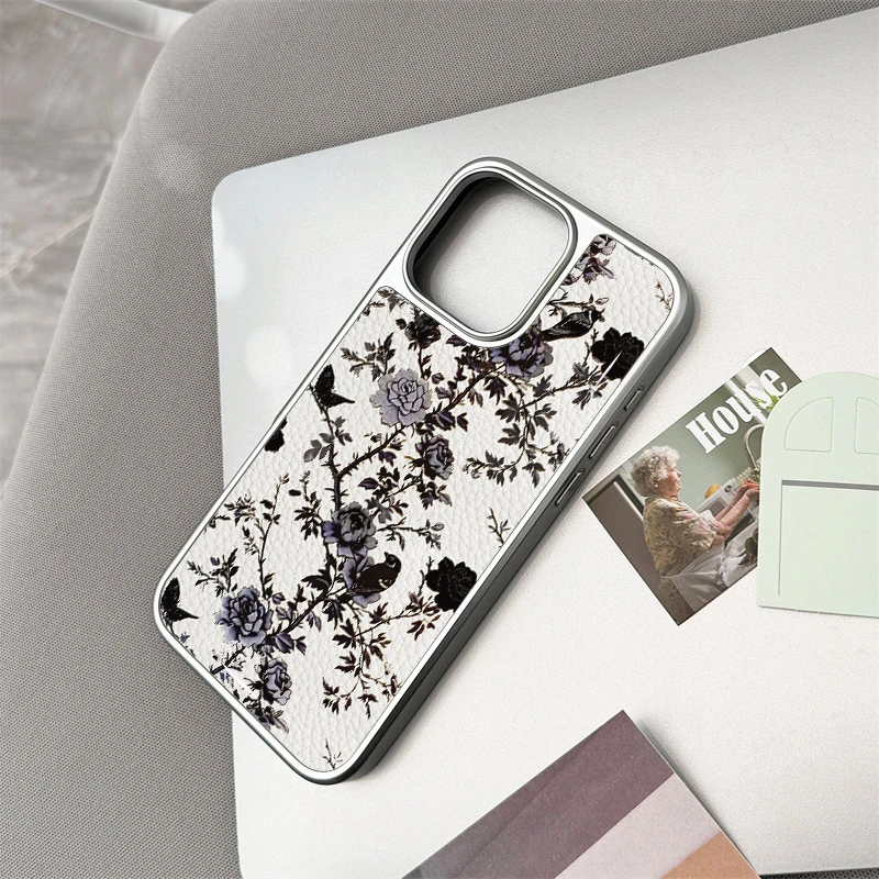 Funda de teléfono con textura de cuero y flores rosas ins para iPhone11/12/13/14/15/16/17 Pro Max AIR PLUS