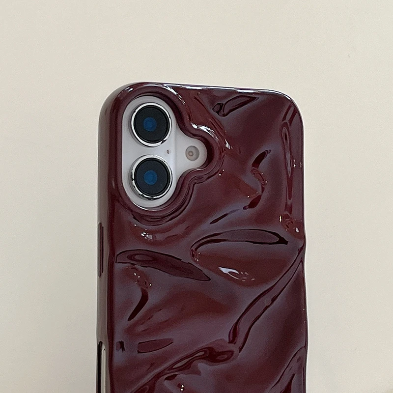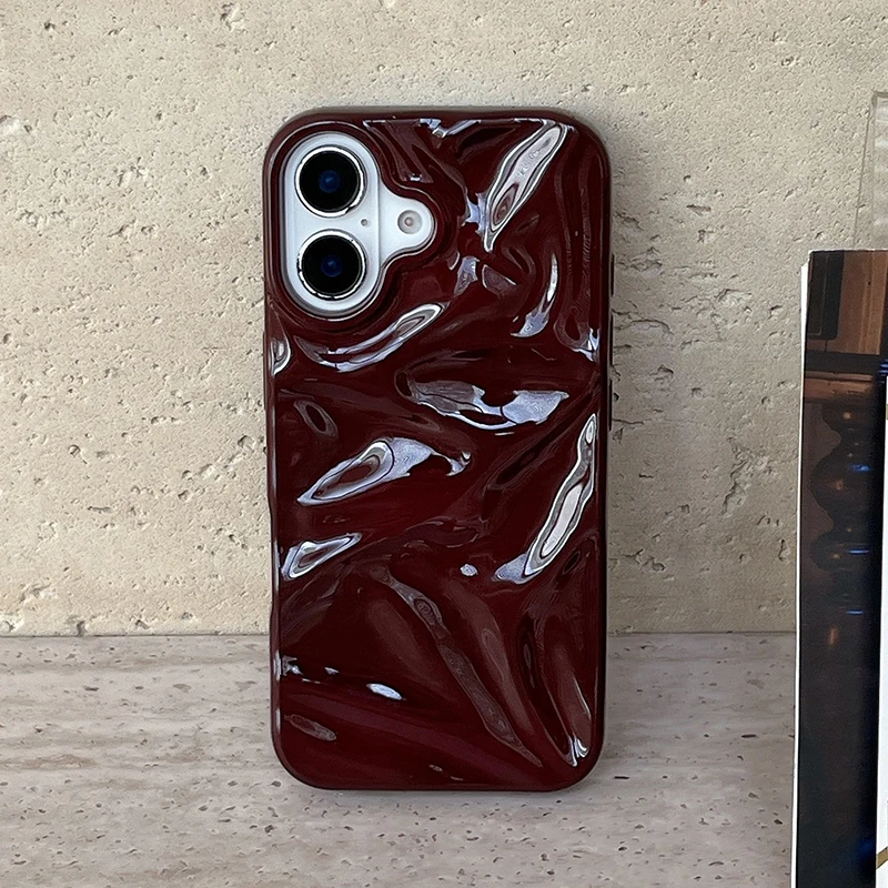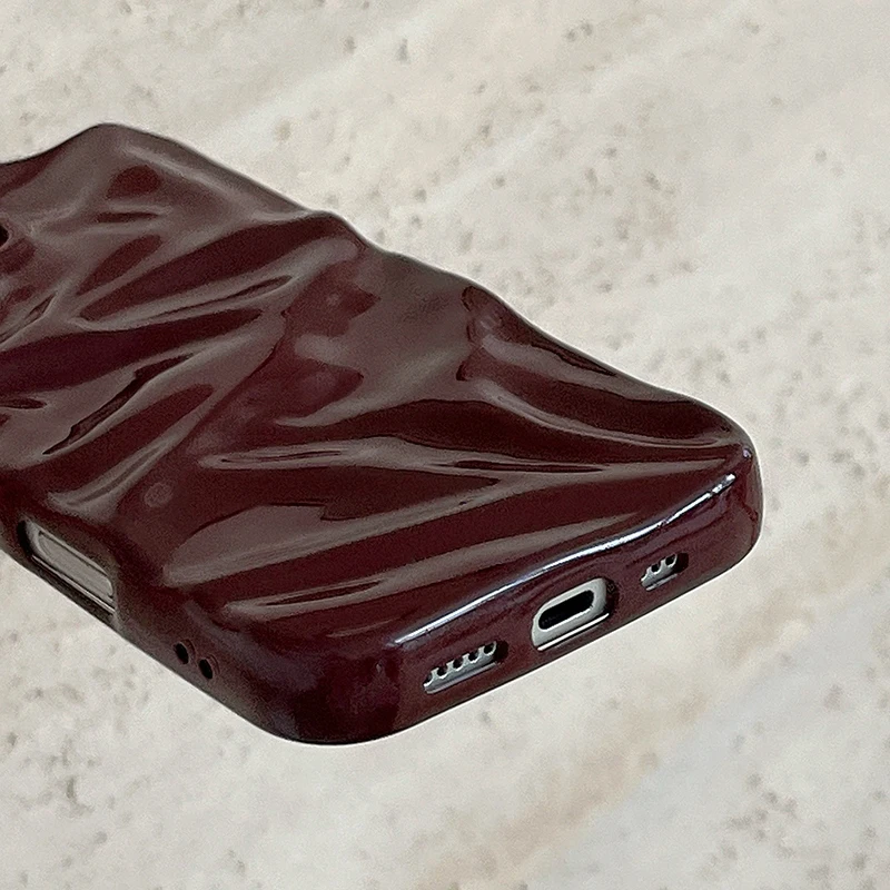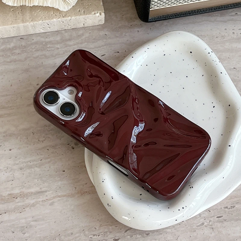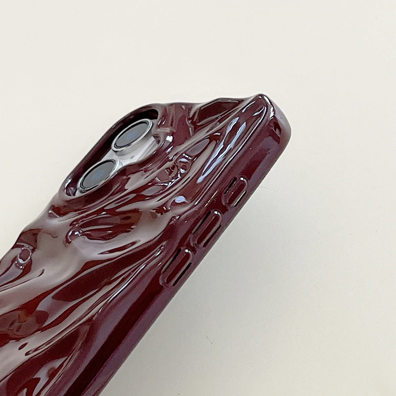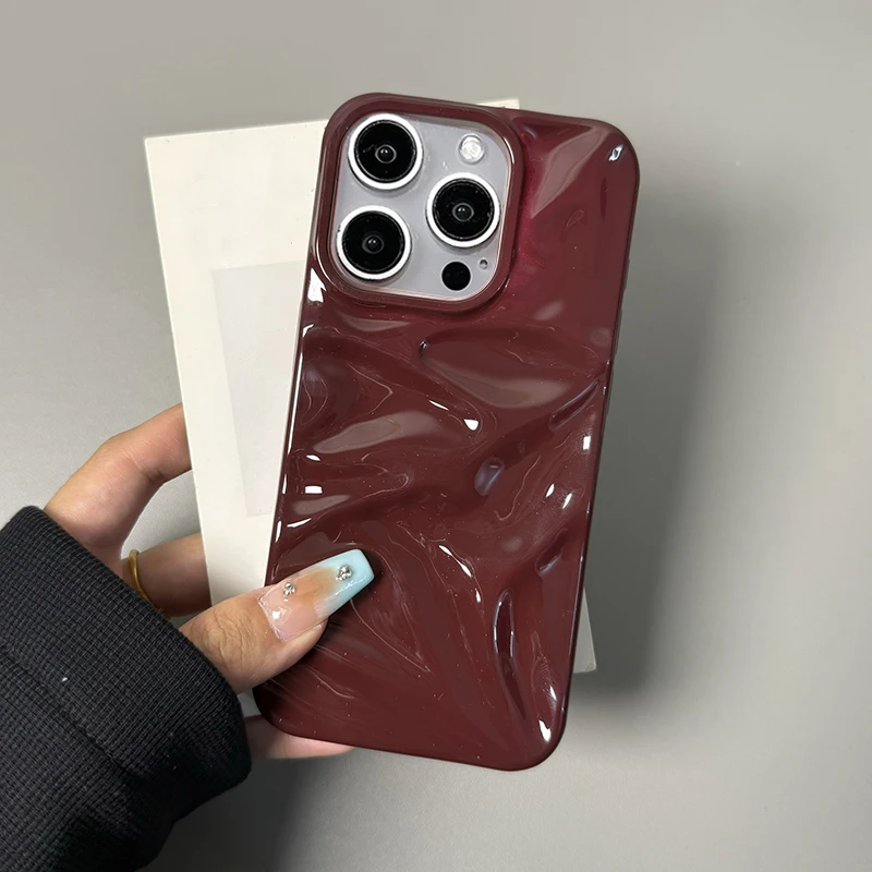 Funda de teléfono con textura ondulada de agua 3D de color rojo vino para iPhone 16 15 13 11 12 Pro Max 14 Plus, funda trasera de silicona brillante