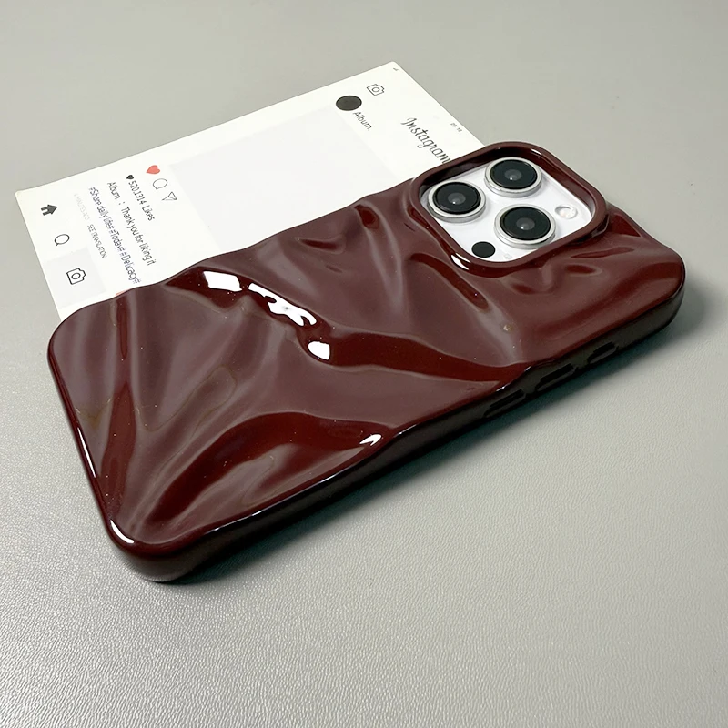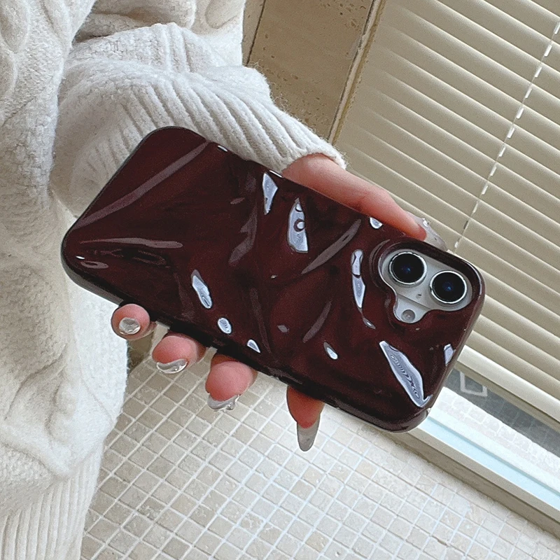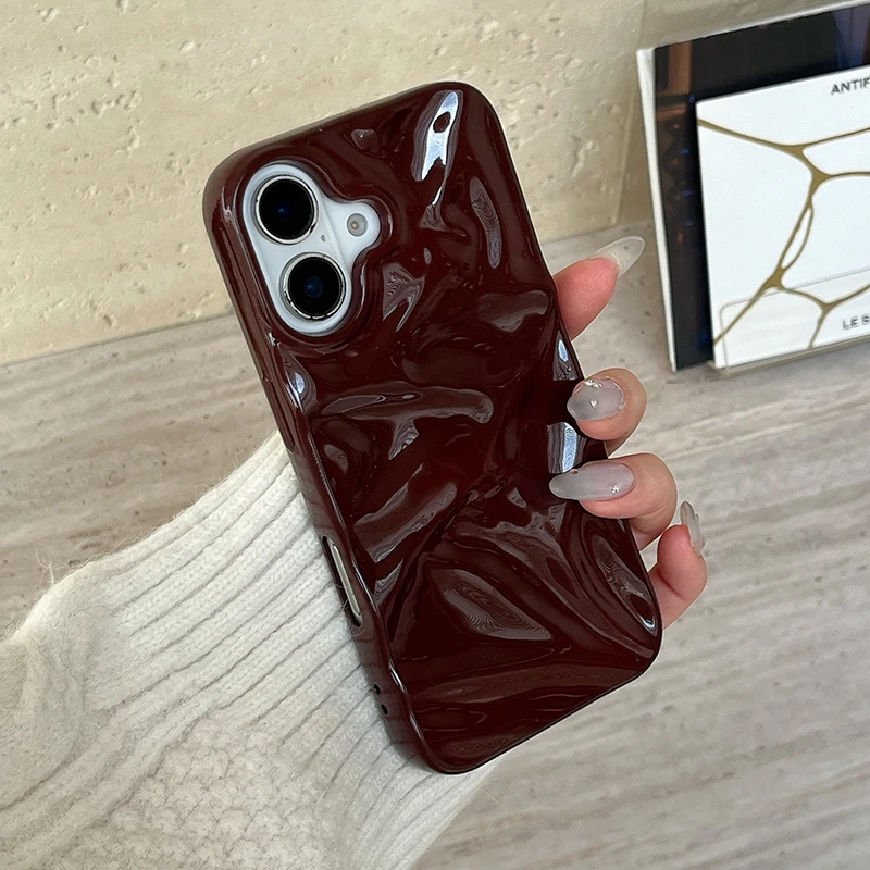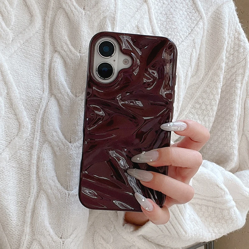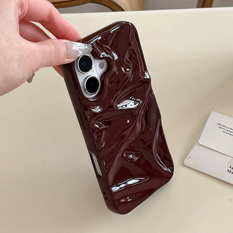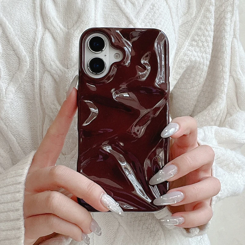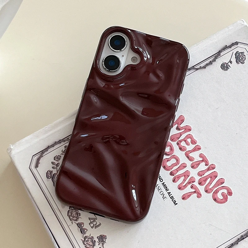 Funda de teléfono con textura ondulada de agua 3D de color rojo vino para iPhone 16 15 13 11 12 Pro Max 14 Plus, funda trasera de silicona brillante