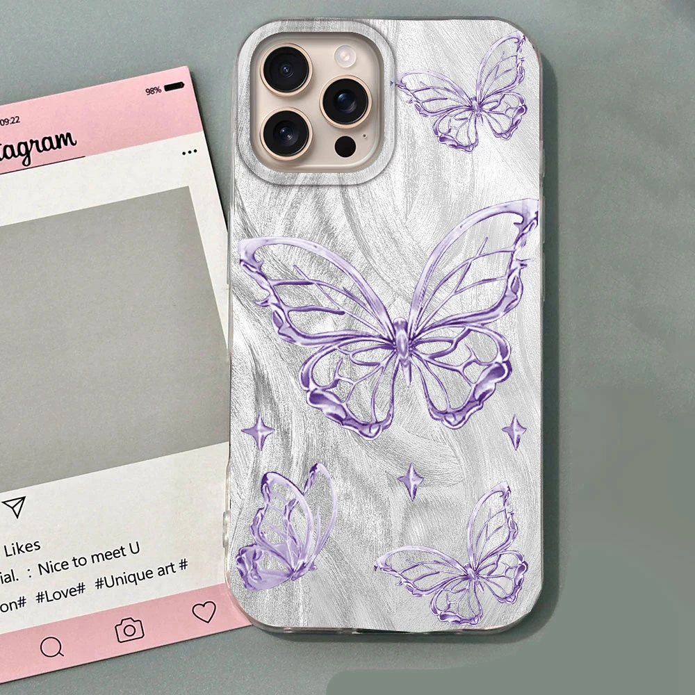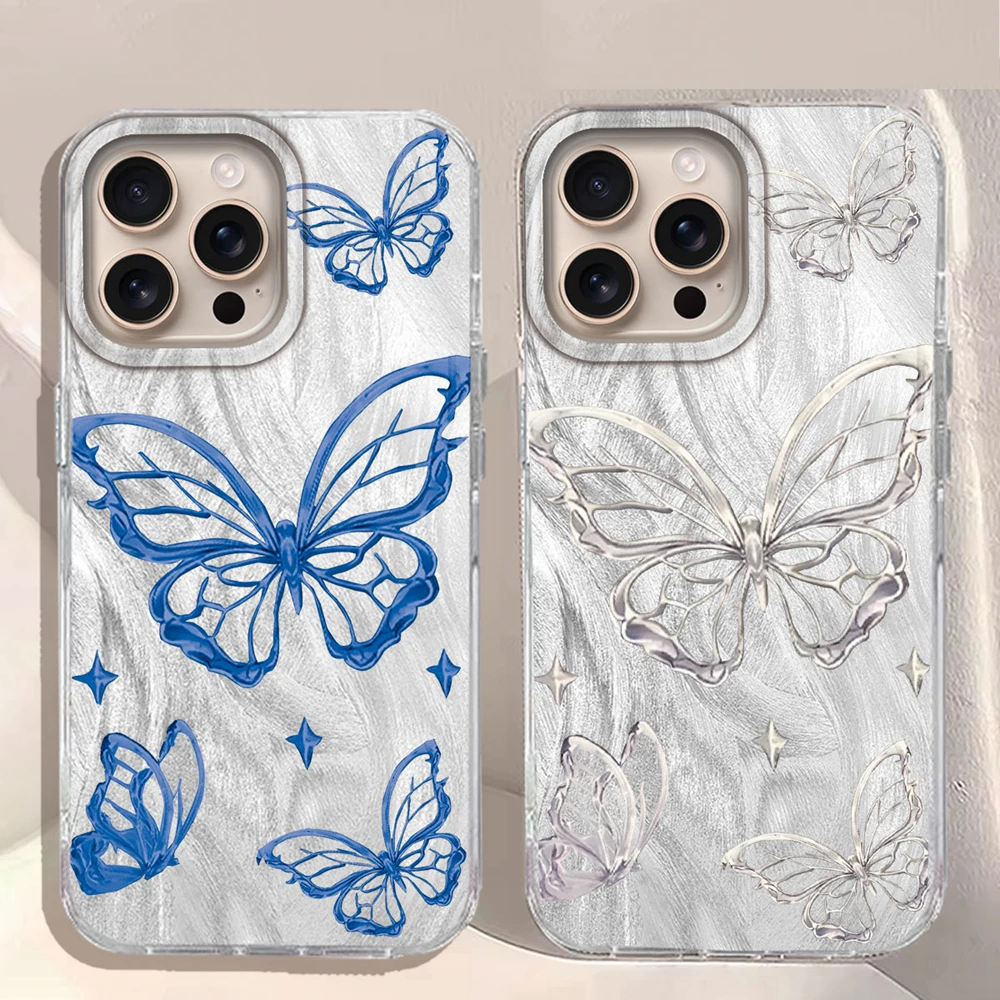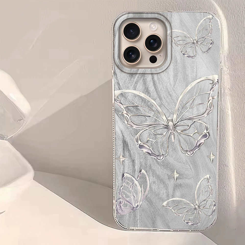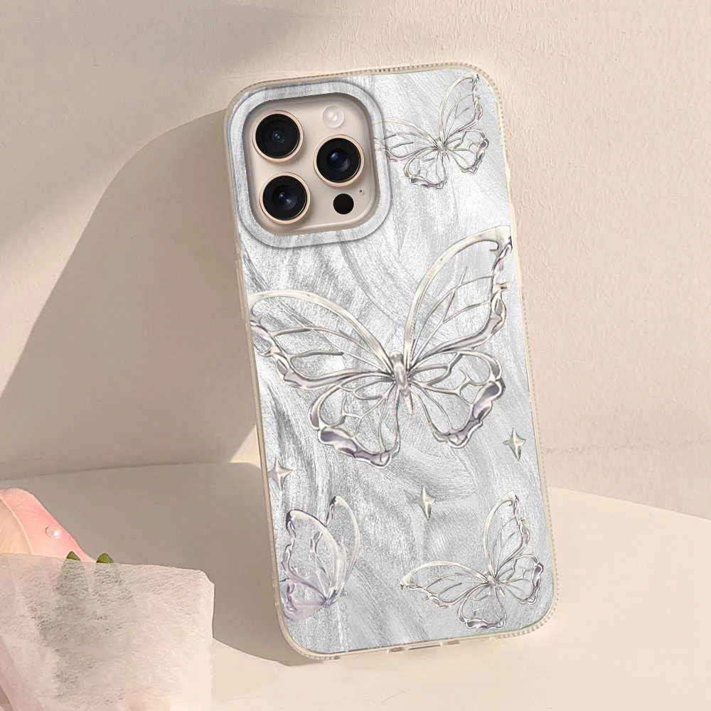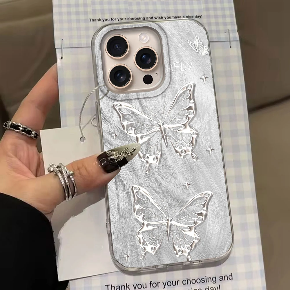 Comprar Funda de teléfono con textura de pluma y mariposa plateada láser para mujer, funda para iphone 16 15 14 7 8 Plus 13 11 12 Pro Max X XS XR SE 2022 16e