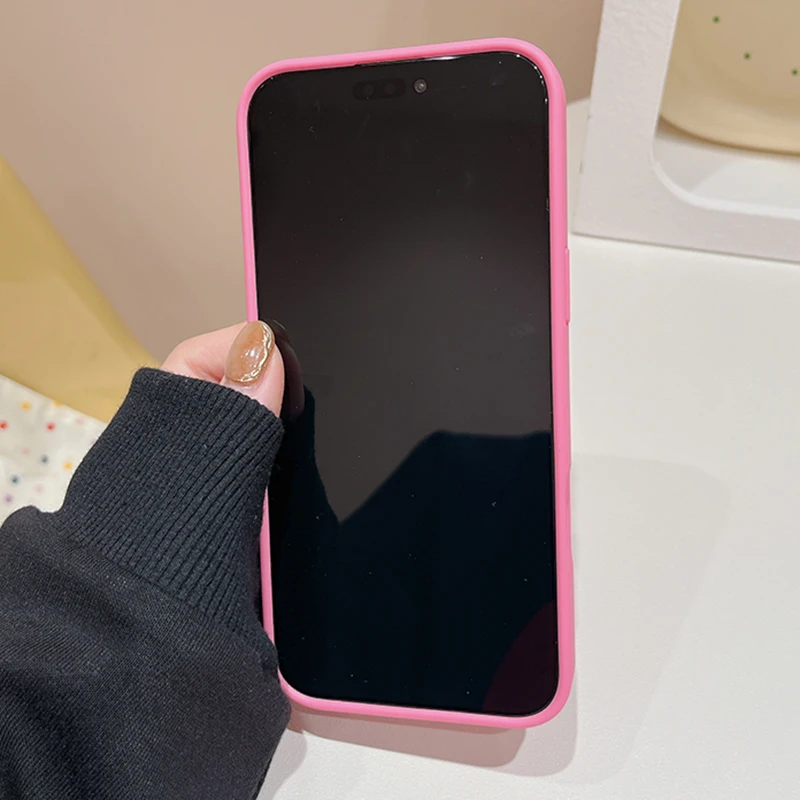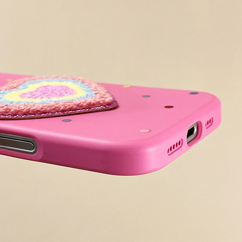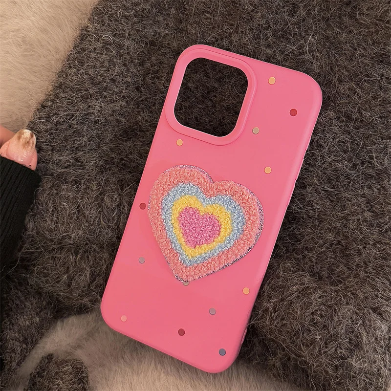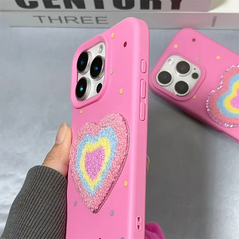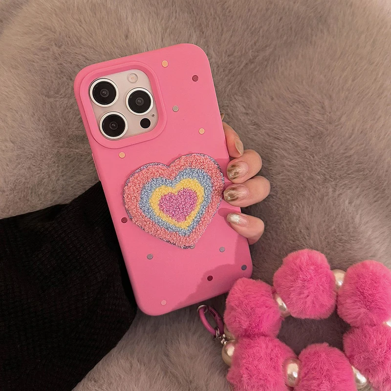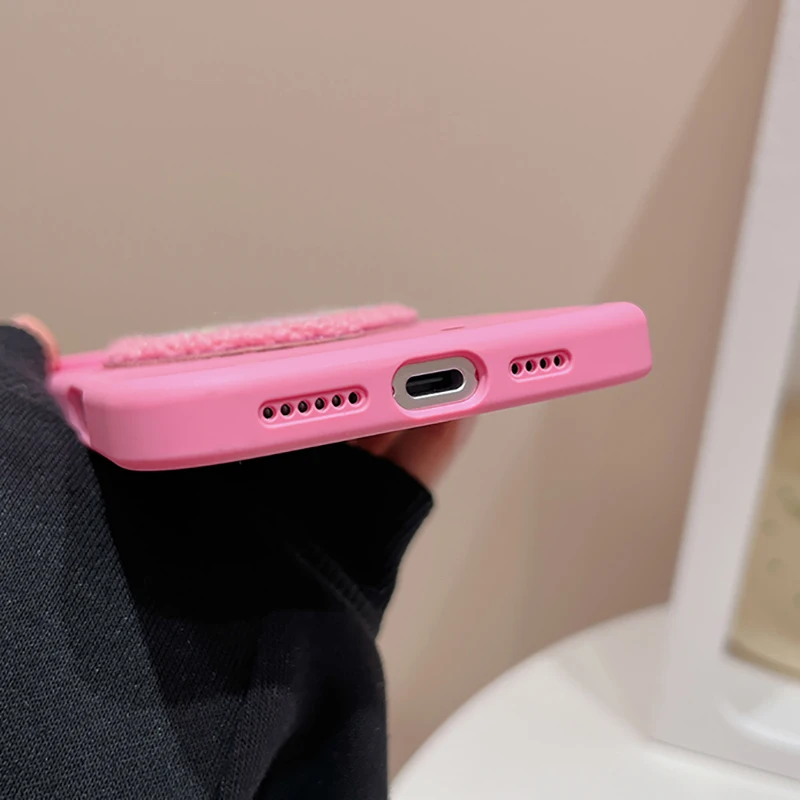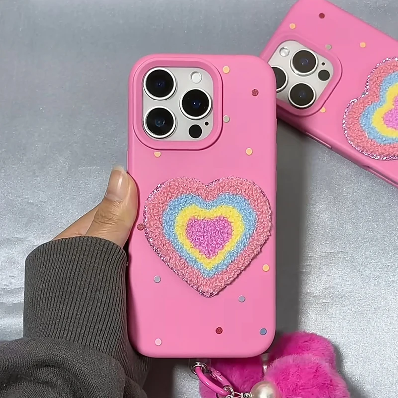 Funda de teléfono de TPU con forma de corazón de amor de felpa rosa para iPhone 16 15 13 14 11 12 Pro Max 16 Plus, funda de silicona suave con pulsera