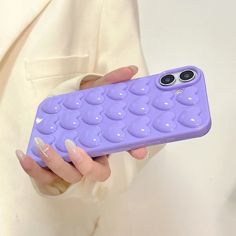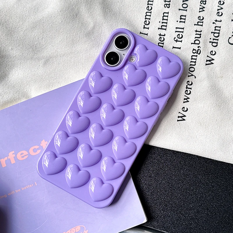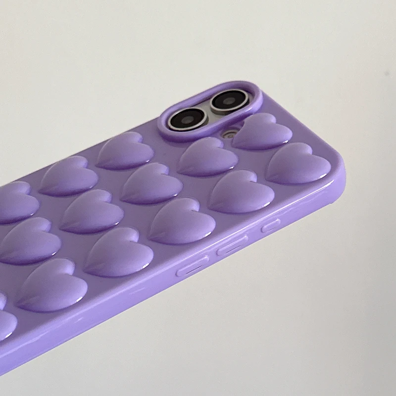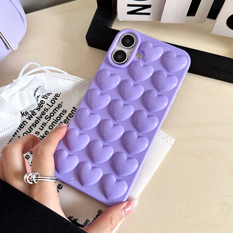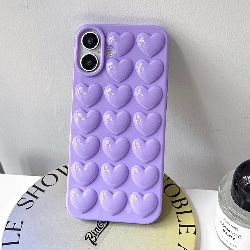 Purple 3D Heart Glossy Silicone TPU Phone Case For iPhone 16 15 14 13 12 11 Pro Max 15 Plus Shockproof Back Cover Funda