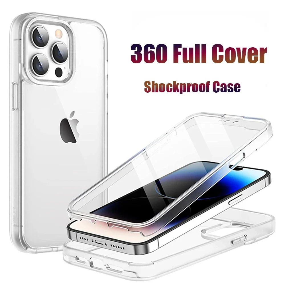 Funda de teléfono transparente a prueba de golpes con protección completa 360 para iPhone 16 15 14 11 12 13 Pro Max, funda trasera de silicona de doble cara TPU para PC