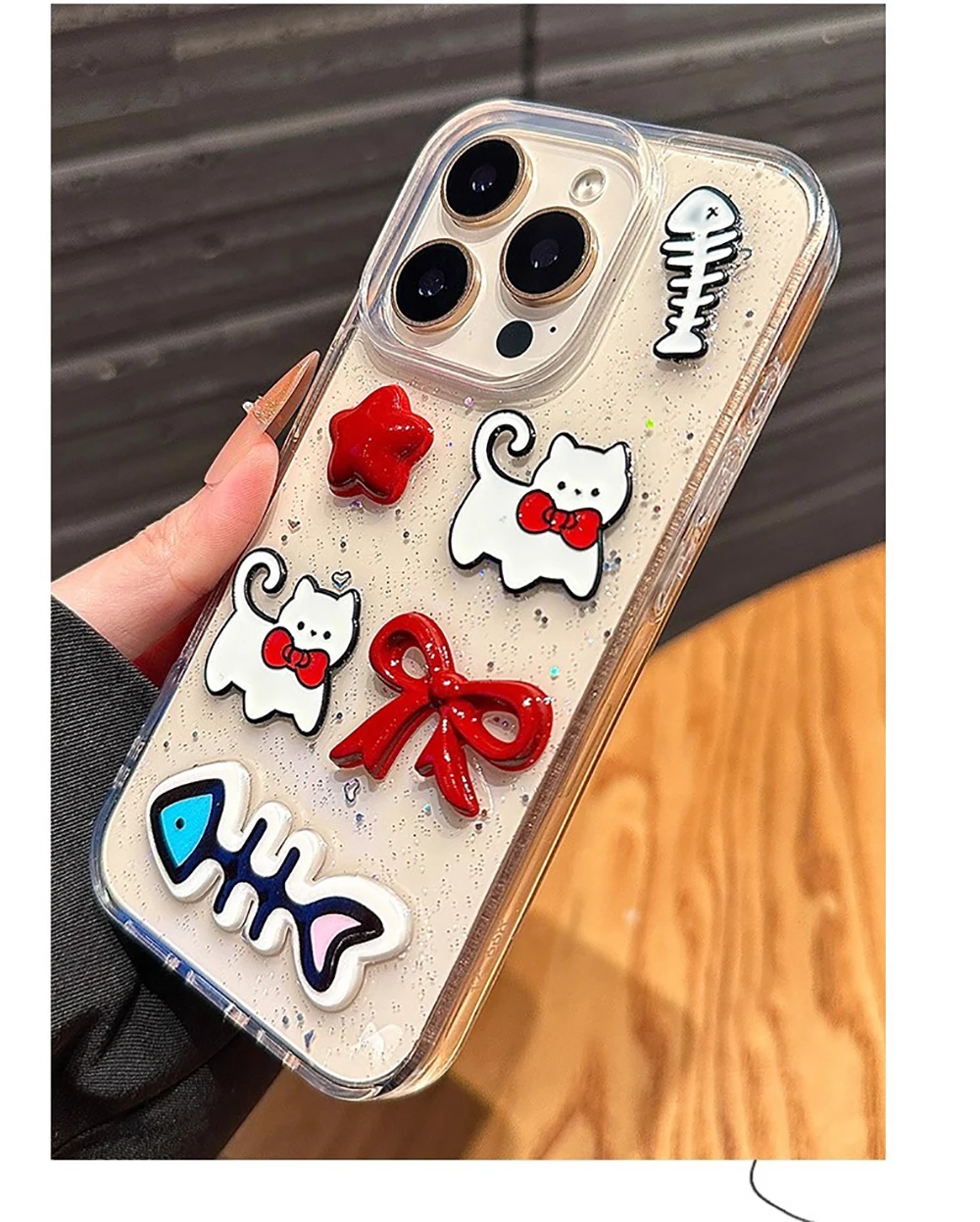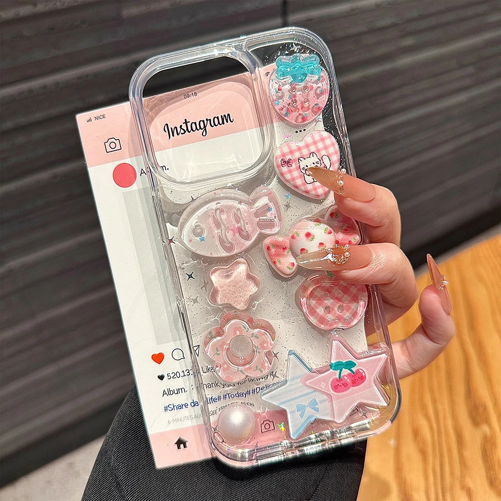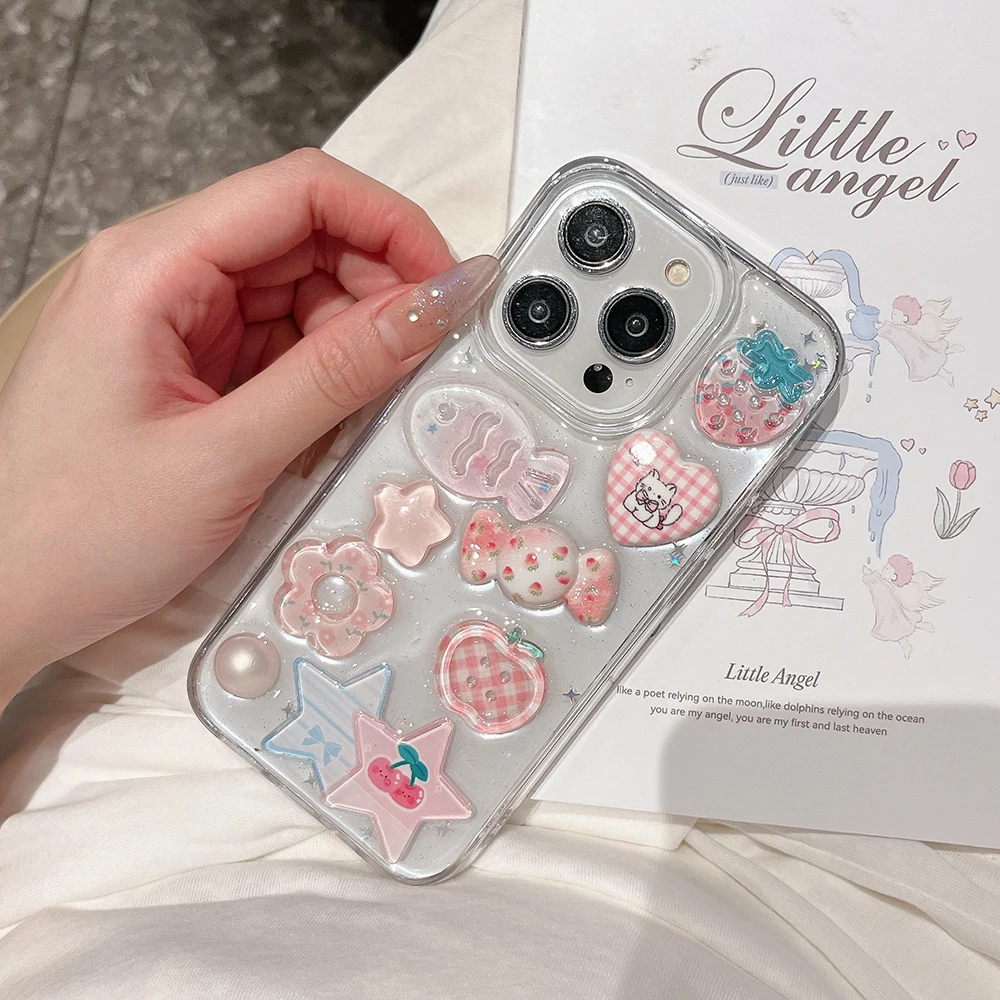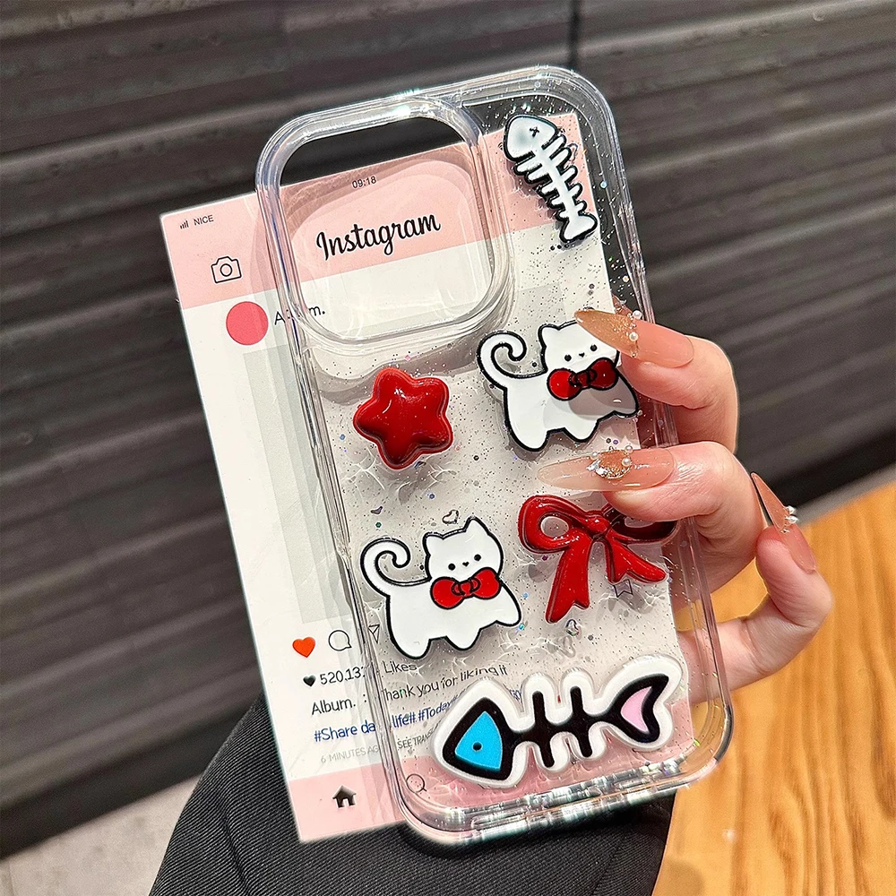Funda de teléfono transparente con purpurina de pez rosa INS 3D, funda trasera elegante a prueba de golpes para iPhone 16 15 14 13 Pro Max