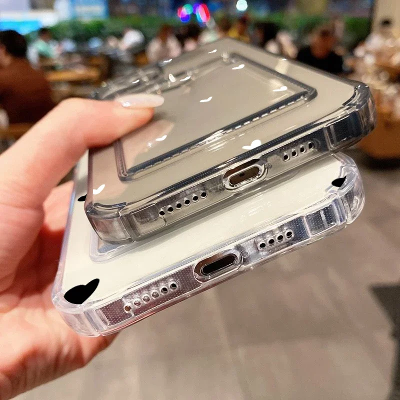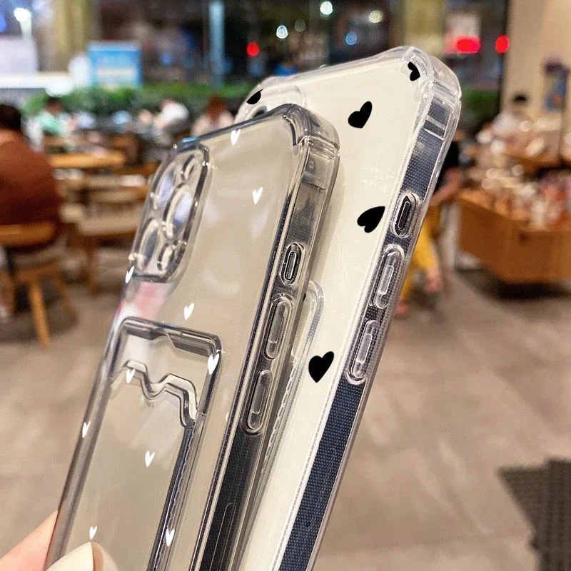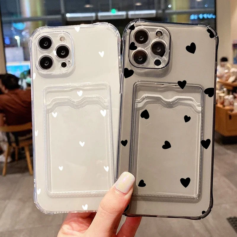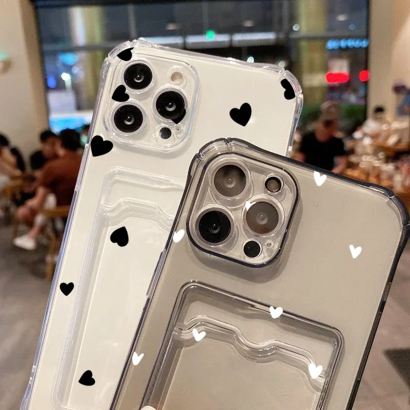 Funda de teléfono transparente suave con diseño de corazón de amor negro para iPhone 16 15 14 13 12 11 Pro Max XS X 7 8 Plus SE 2022 funda tipo billetera para tarjetas