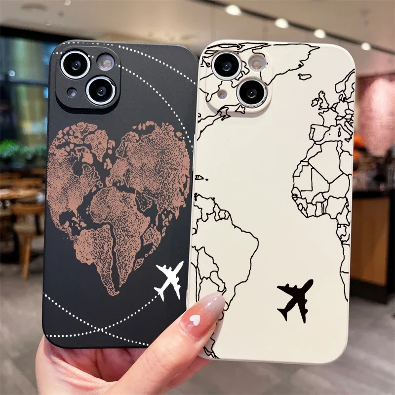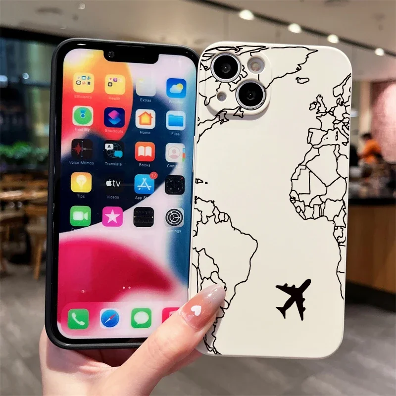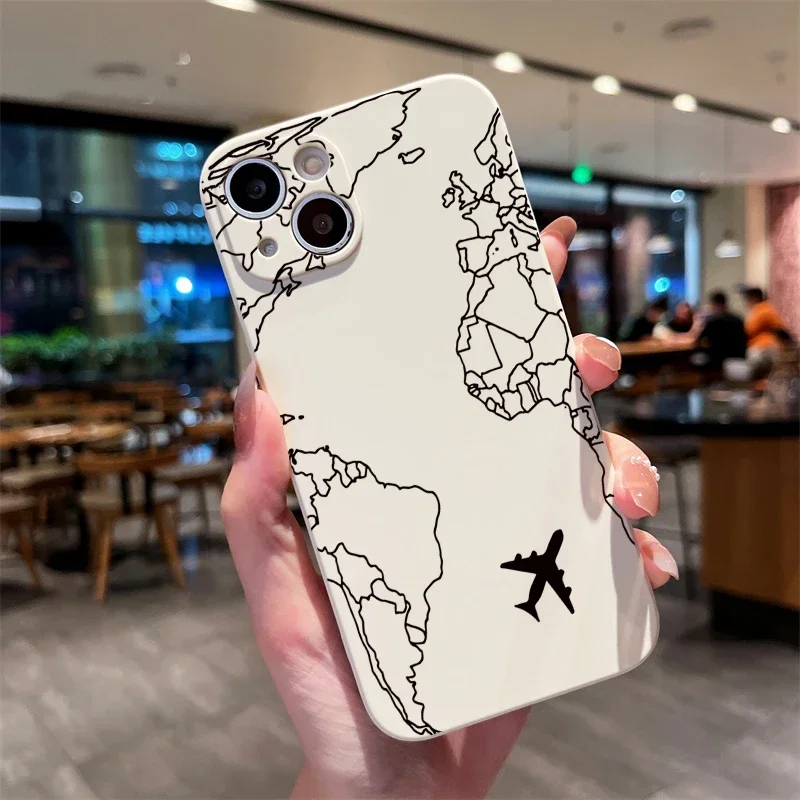Funda de teléfono de viaje con mapa del mundo de aviones para iPhone 15 Pro Max, funda suave a prueba de golpes para iPhone 14 13 12 11 XS XR X 7 8 Plus SE 2022